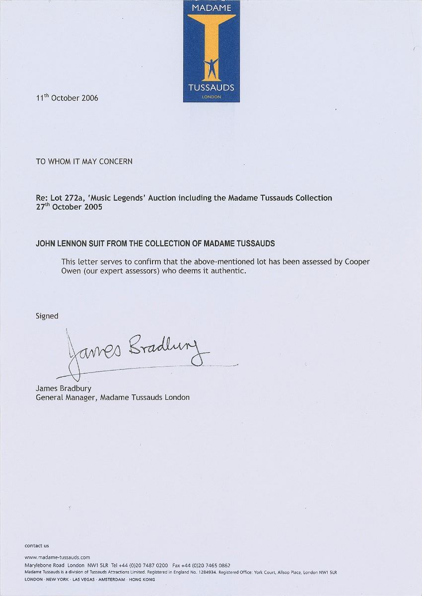 In March 1964, Madame Tussauds debuted their first set of Beatles wax figures that were dressed in a set of specially commissioned collarless Millings-made suits. Lennon later provided this suit to Madame Tussauds in London for use in a future display the museum. A letter from Madam Tussauds accompanies the lot. Both the jacket and trousers are in very fine condition. This is a rare opportunity to own a full suit from one of the most important artists of all time.