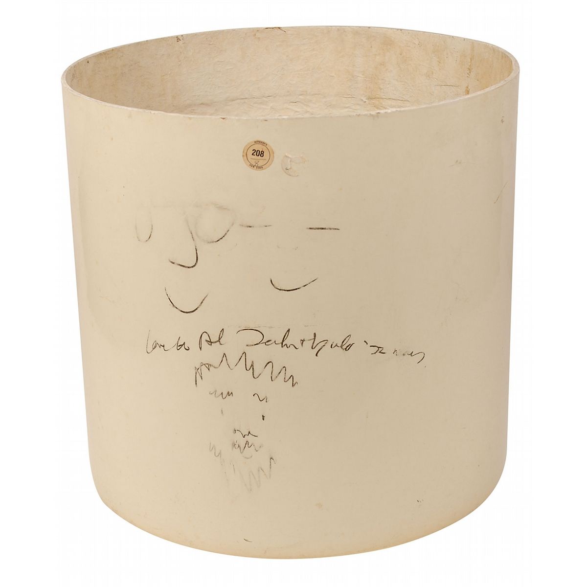 Unique 14-inch tall off-white planter, 14.5-inch diameter, signed and inscribed on the side in black felt tip, “Love to Al, John & Yoko, ’72 May,” along with one of Lennon’s great self-portrait doodles of him and Yoko. Below, Lennon has added a somewhat lion-like caricature, possibly of the original recipient. Scattered marks and soiling, remnants of potting soil to the inside, and some brushing to the sketch and signature, otherwise fine condition. A Sotheby’s label is also affixed to the top. Certainly one of the most atypical items we have offered from Lennon, dating to shortly after he released Imagine.