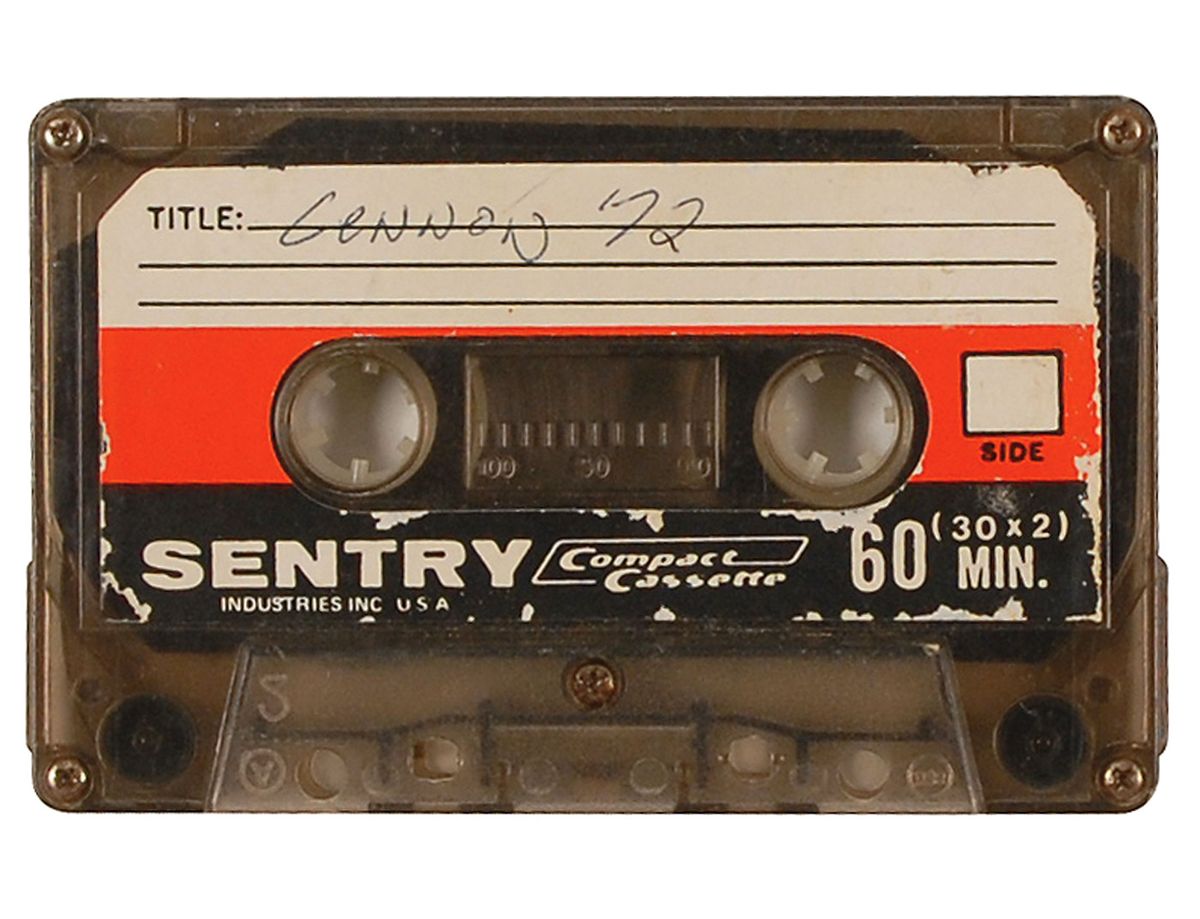 Original 60 minute Sentry cassette tape featuring an unreleased recording of a rehearsal for Lennon’s ‘One to One’ benefit concert at Madison Square Garden on August 30, 1972. A ballpoint notation to the tape’s label reads, “Lennon ’72.” Some wear to the label, otherwise fine condition. Audio is in stereo, approximately 30 minutes long, and includes three distinguishable songs, a saxophone solo, various instruments warming up, Yoko singing, and various ‘stage chatter,’ including Lennon giving instructions to his band. The highlight is undoubtedly an 8-minute rendition of ‘Come Together’—it is a relatively polished session, but Lennon pauses a few times to make tweaks and adjustments. The other two songs are sung by Ono, one of which is ‘We’re All Water.’ Accompanied by a letter of provenance that states the tape was a gift from Gary Van Scyoc, a bass player in Lennon’s backing band, Elephant’s Memory, and is an original tape from 1972 of which no copies have been made. The ‘One to One’ concerts were Lennon’s only rehearsed and full-length live performances in his solo career, and the last time he performed live with Ono.