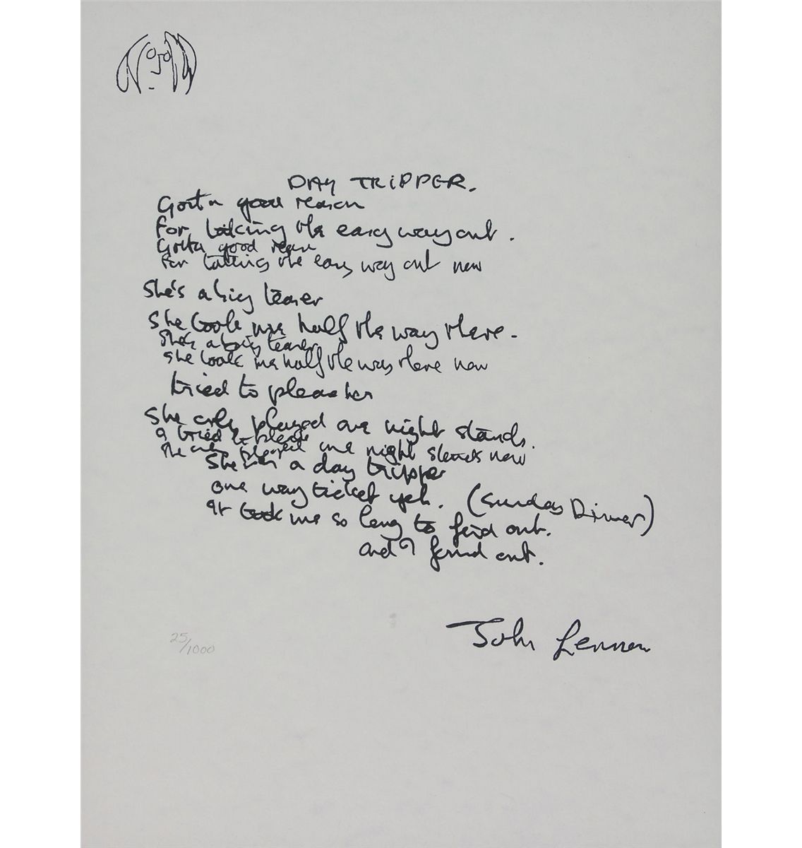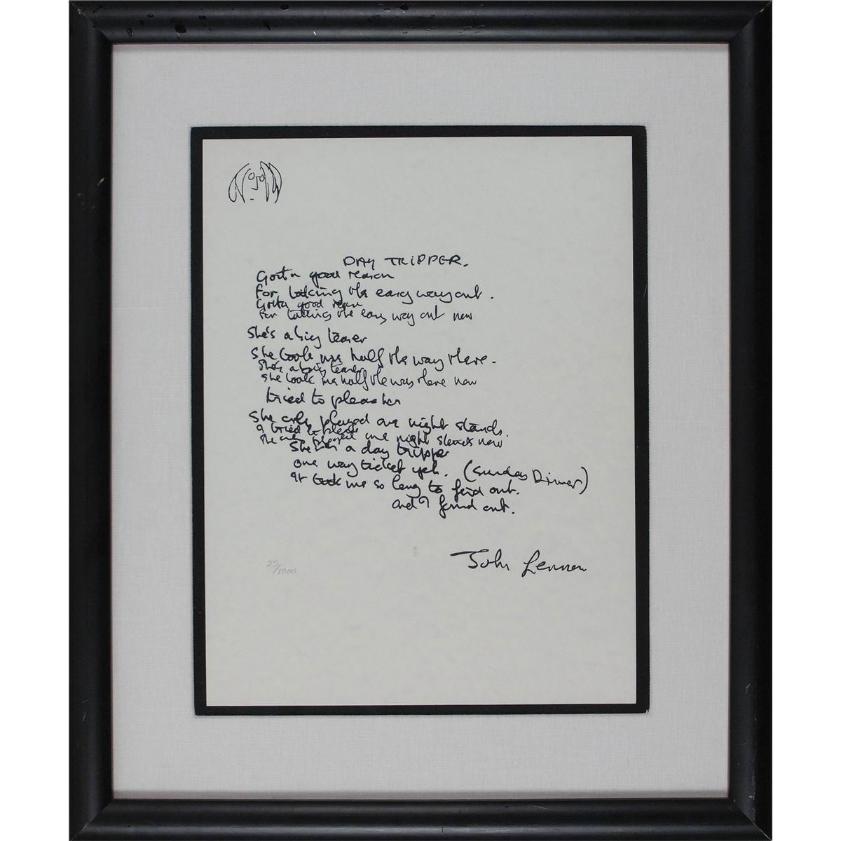 Limited edition 9.5 x 12.75 silkscreen print of Lennon’s handwritten lyrics entitled ‘Day Tripper,’ numbered 25/1000, from the suite titled ‘The Beatle Years.’ Double-cloth-matted and framed to an overall size of 15.5 x 18.5. In very fine condition.