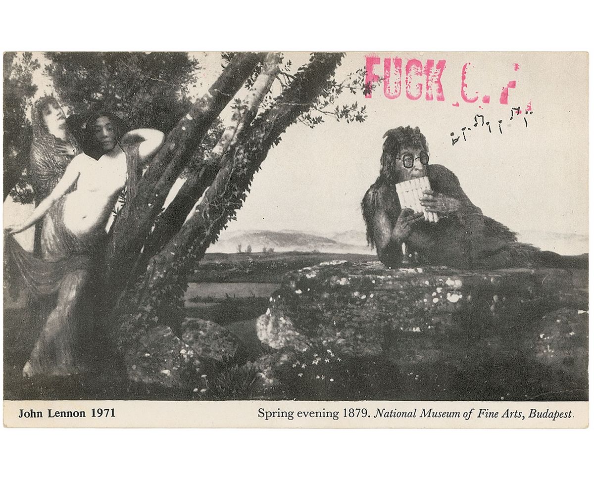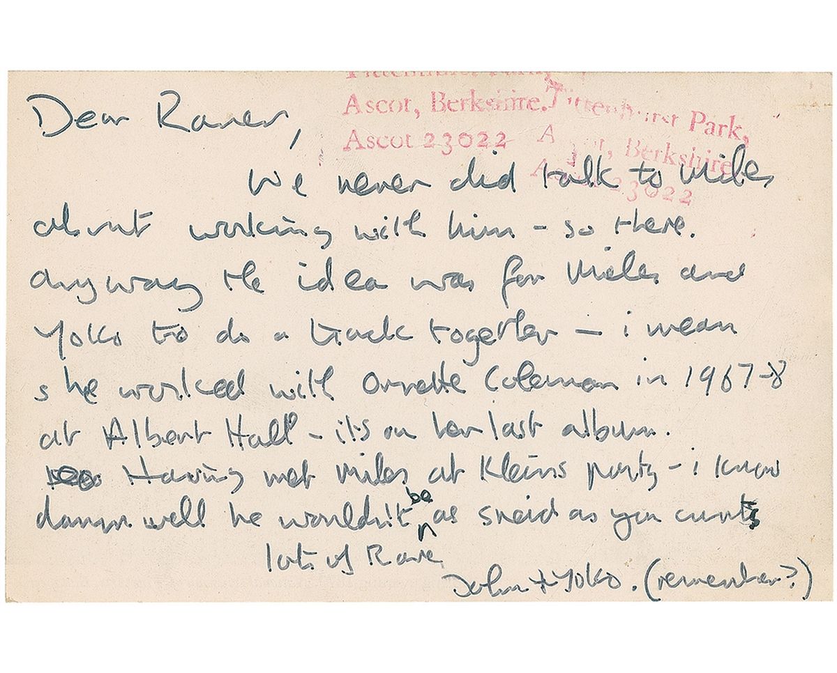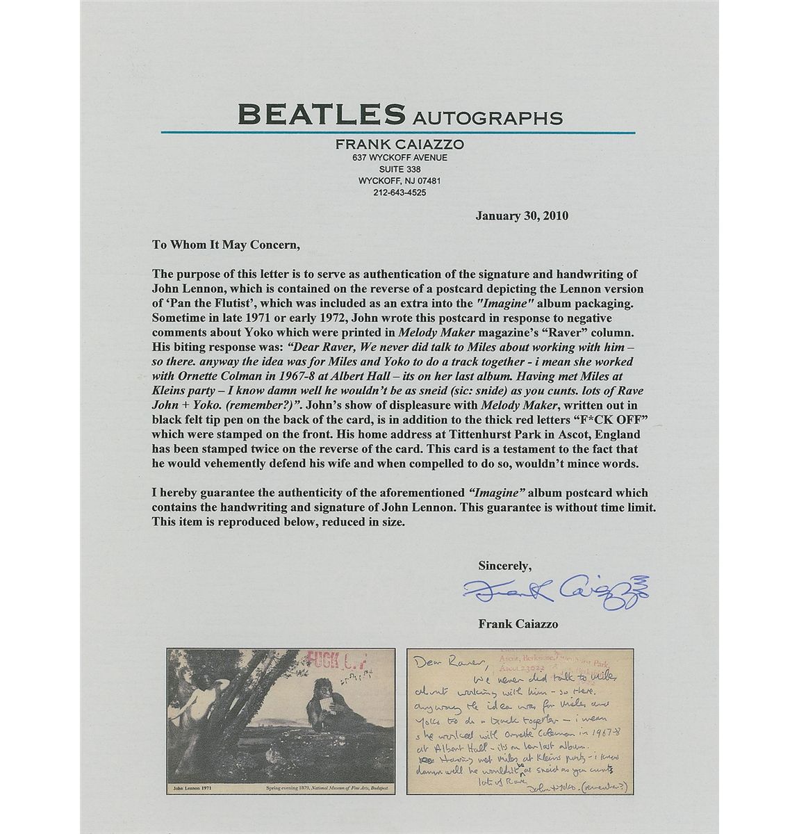 Pointedly defensive ALS signed “John & Yoko (remember),” on the correspondence side of a 5.75 x 3.75 postcard depicting the Lennon version of ‘Spring Evening 1879,’ no date but circa late 1971 or early 1972. In response to negative comments about Yoko which were printed in Melody Maker magazine’s Raver column, Lennon writes in full: “Dear Raver, We never did talk to Miles about working with him–so there. Anyway the idea was for Miles and Yoko to do a track together—i mean she worked with Ornette Coleman in 1967–8 at Albert Hall—it’s on her last album. Having met Miles at Klein’s party—i know damn well he wouldn’t be as sneid [sic] as you cunts. Lots of Rave.” Lennon’s home address of Tittenhurst Park in England has been stamped twice at the top of the correspondence side, in addition to a thick red stamp on the image side reading “FUCK OFF.” Some scattered light creasing and soiling, otherwise fine condition. Accompanied by a letter of authenticity from noted Beatles expert Frank Caiazzo, stating “This card is a testament to the fact that he would vehemently defended his wife, and when compelled to do so, wouldn’t mince words.”