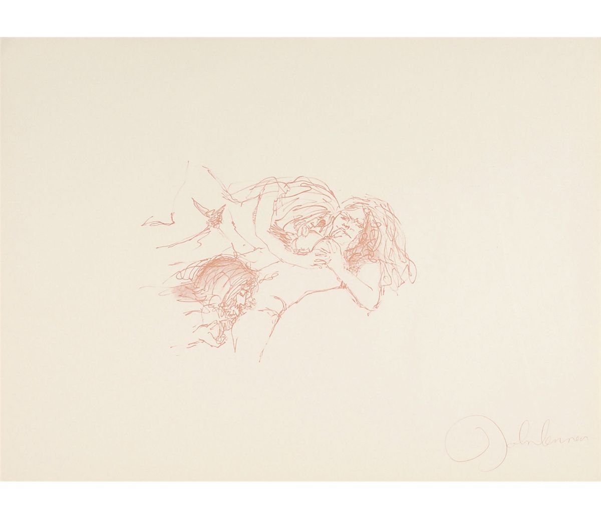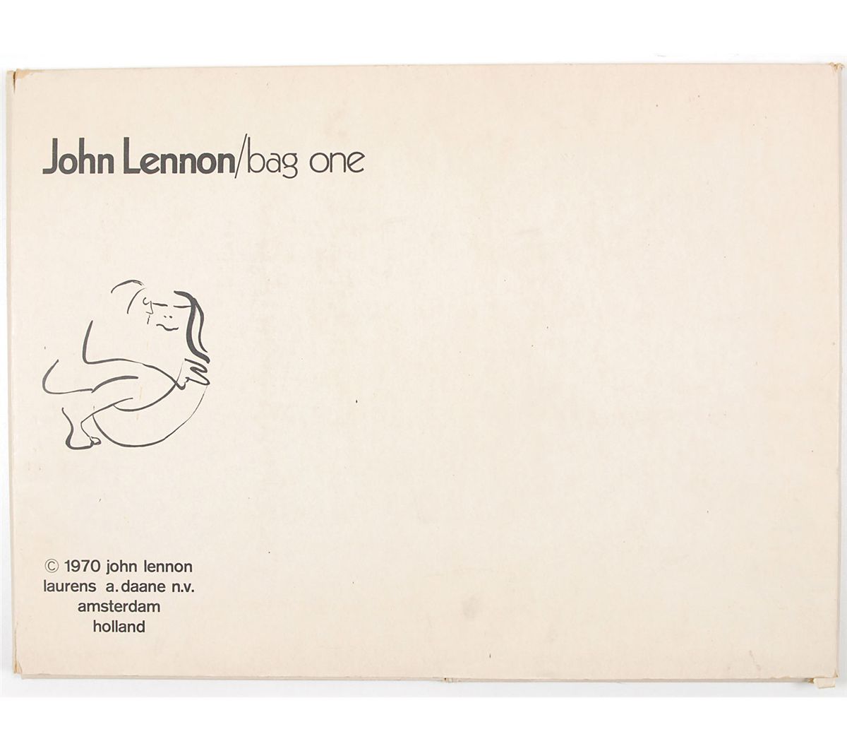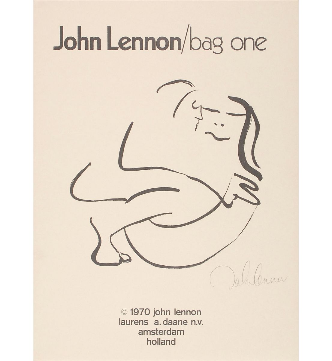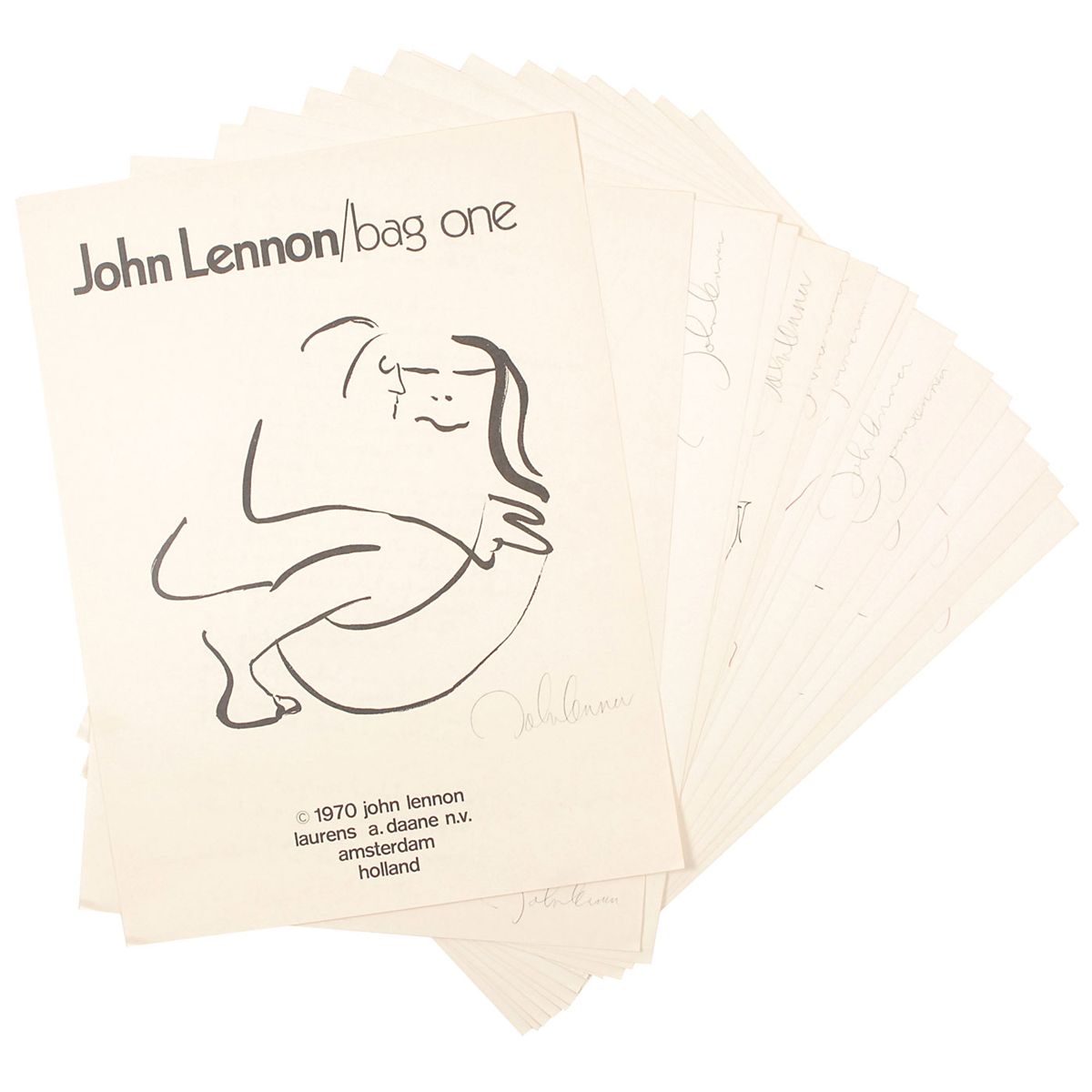 Complete limited edition set of Lennon’s ‘Bag One’ prints, published by Laurens A. Danne of Amsterdam, Holland, in 1970. All 15 prints measure 14.5 x 20 or 20 x 14.5, each bearing a facsimile of Lennon’s signature. Prints are accompanied by their original envelope, numbered 000391. Scattered soiling and a few tears to envelope, otherwise fine condition. The Bag One’ series was first published and exhibited in January 1970 at the London Art Gallery. On the second day the exhibition was closed by Scotland Yard and the erotic lithographs confiscated.