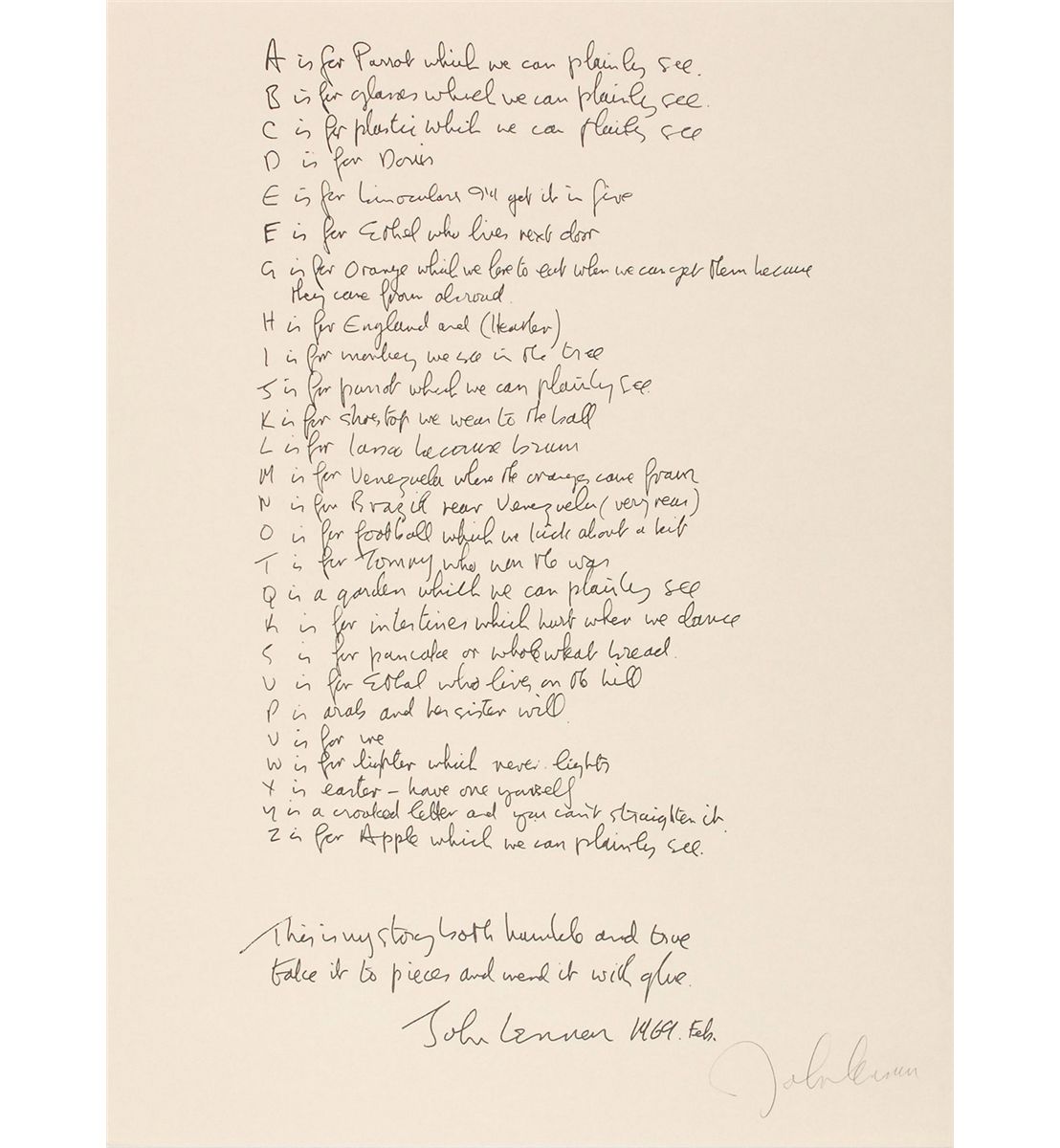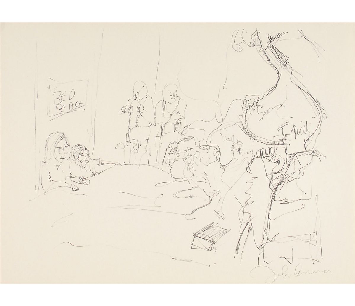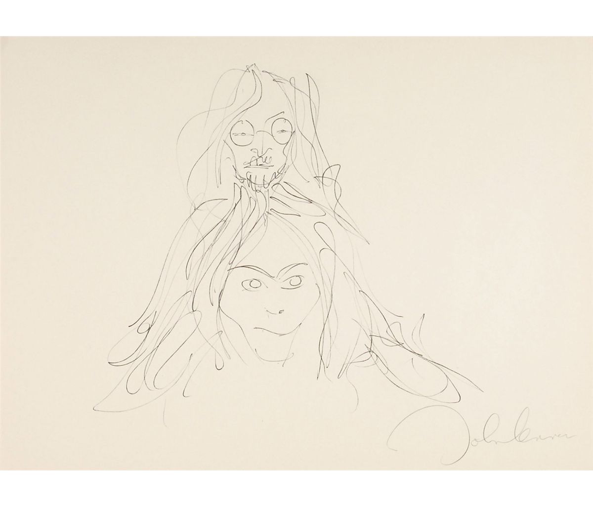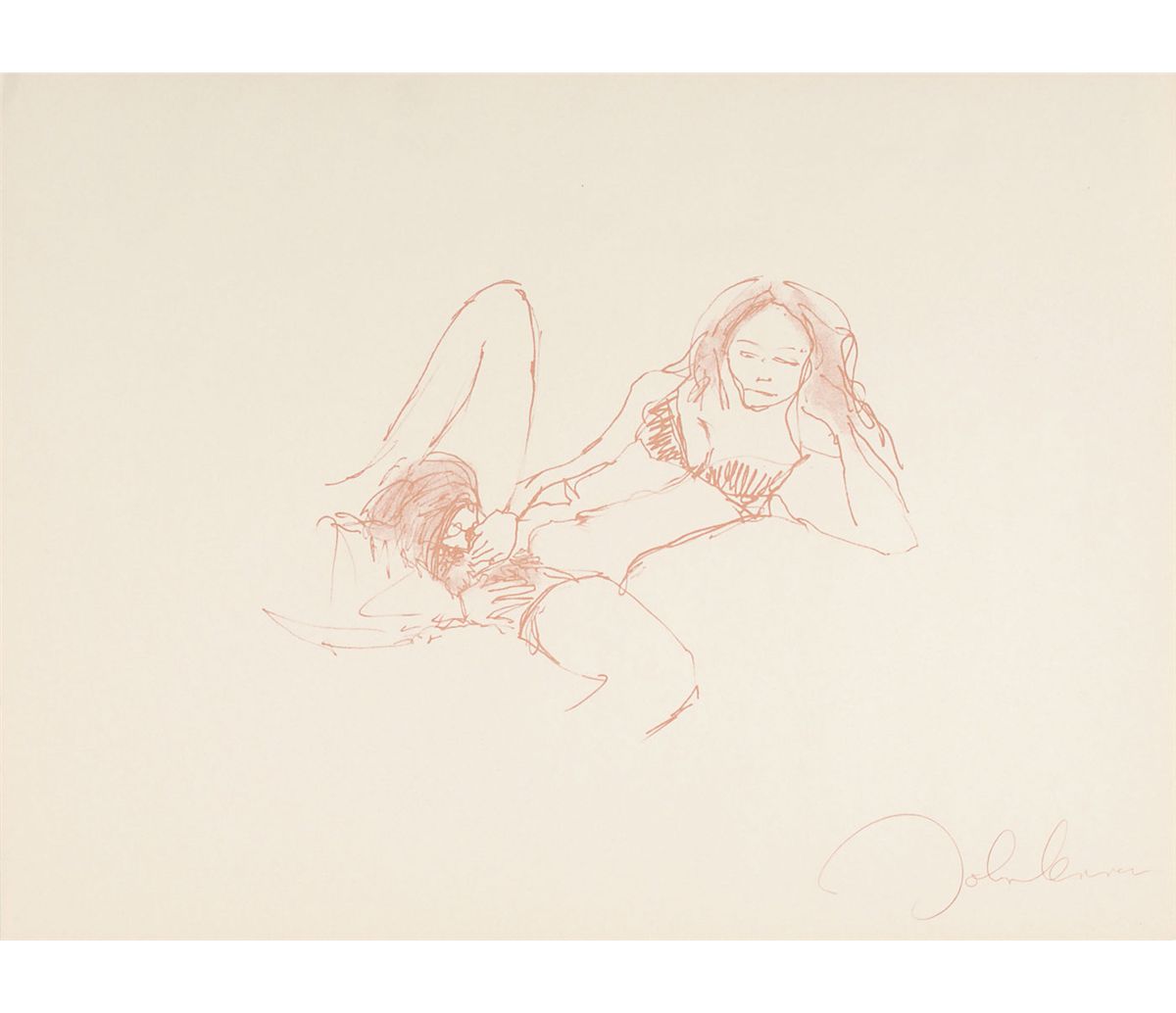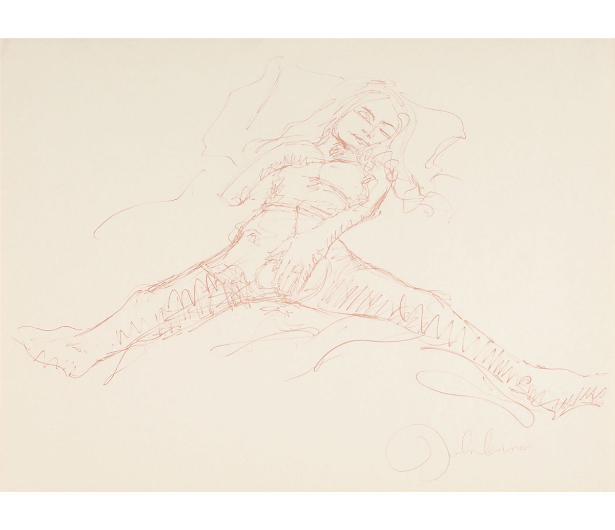 Complete limited edition set of Lennon’s ‘Bag One’ prints, published by Laurens A. Danne of Amsterdam, Holland, in 1970. All 15 prints measure 14.5 x 20 or 20 x 14.5, each bearing a facsimile of Lennon’s signature. Prints are accompanied by their original envelope, numbered 000391. Scattered soiling and a few tears to envelope, otherwise fine condition. The Bag One’ series was first published and exhibited in January 1970 at the London Art Gallery. On the second day the exhibition was closed by Scotland Yard and the erotic lithographs confiscated.