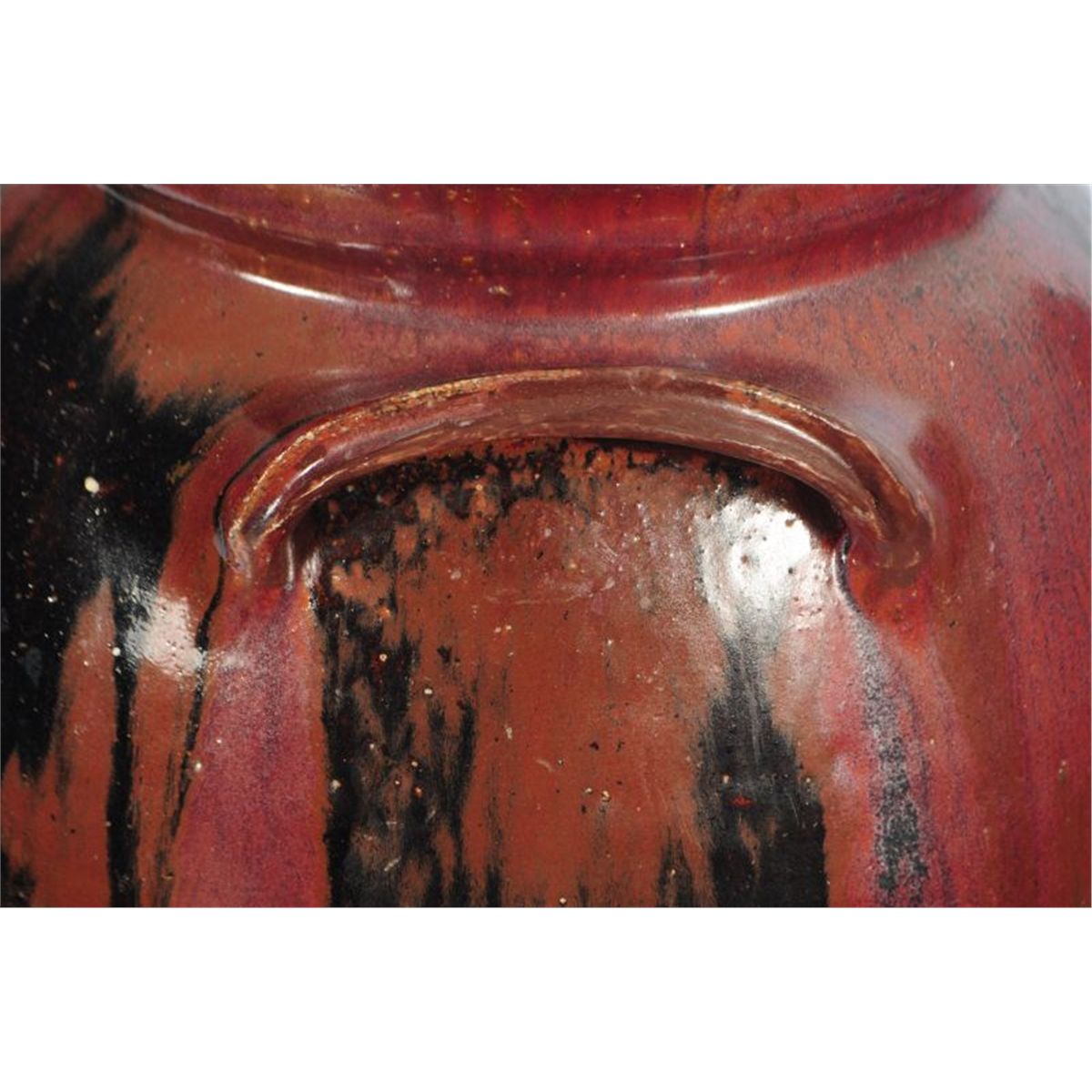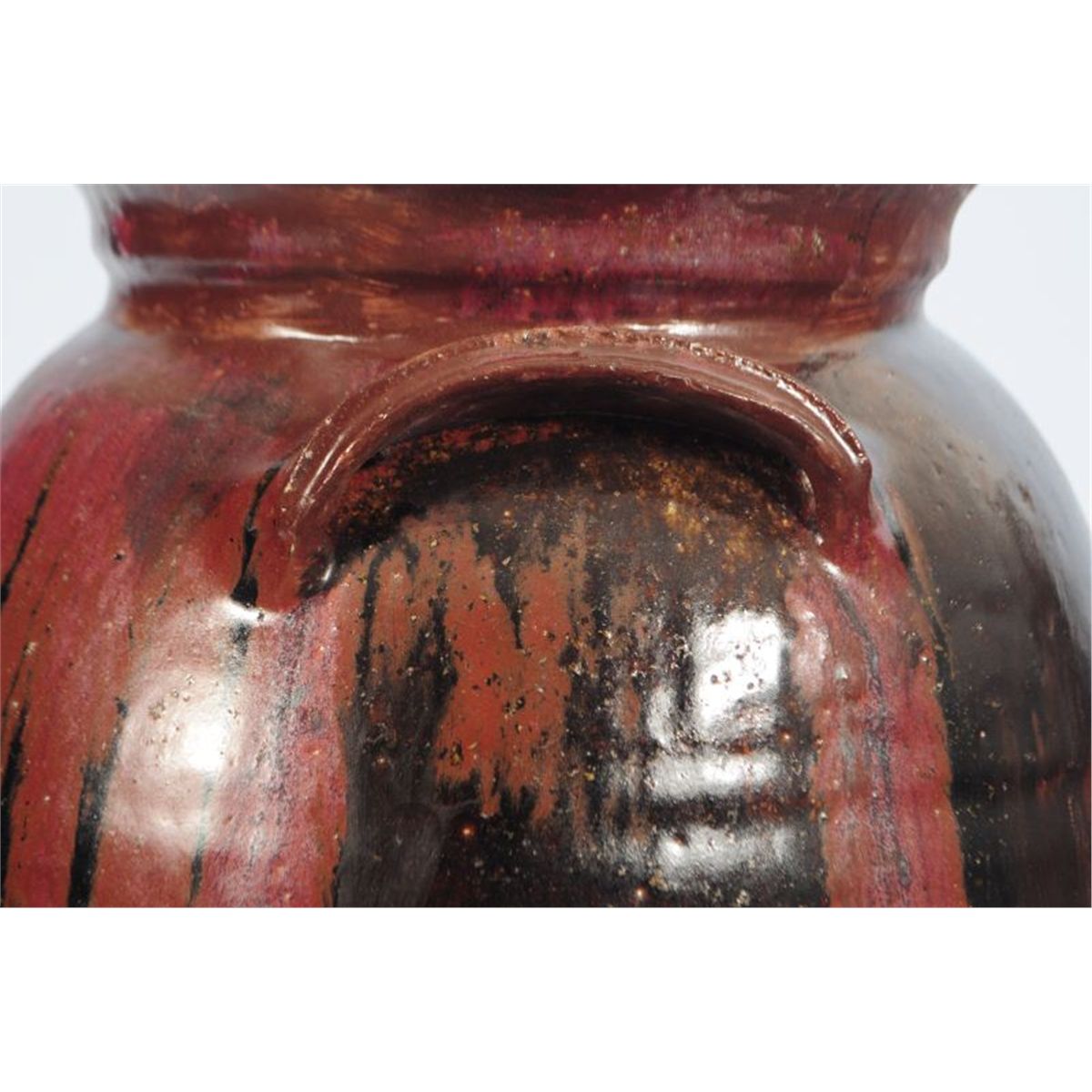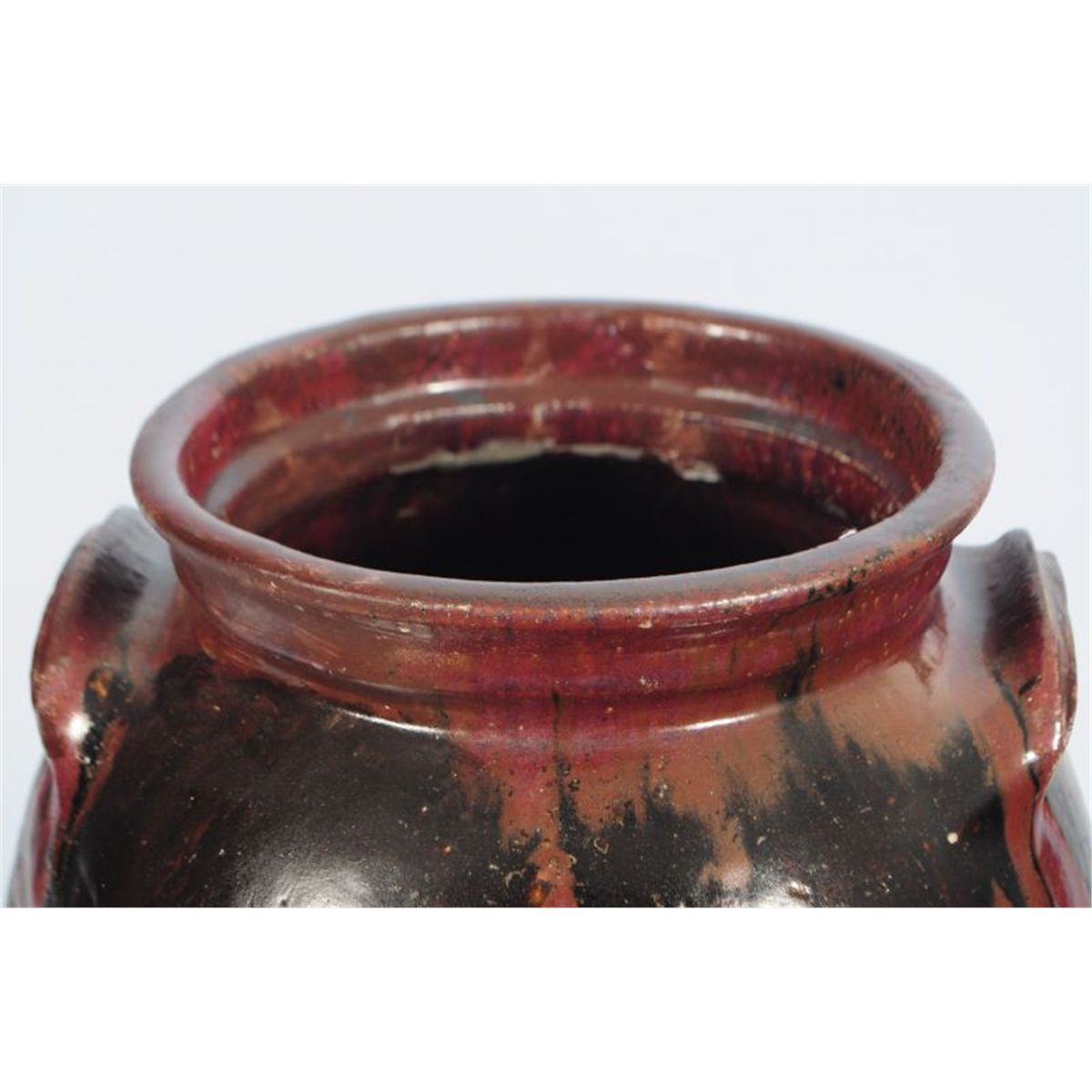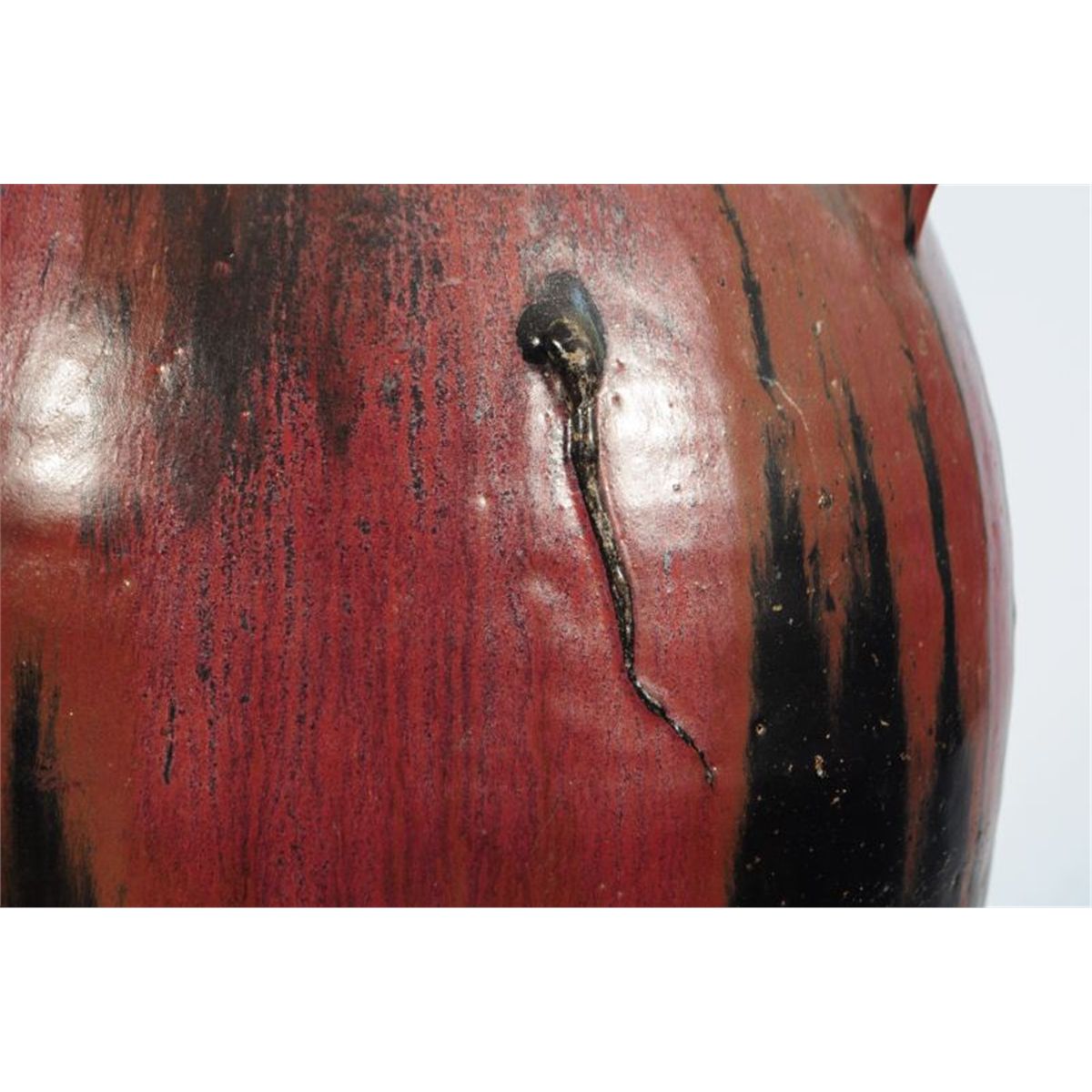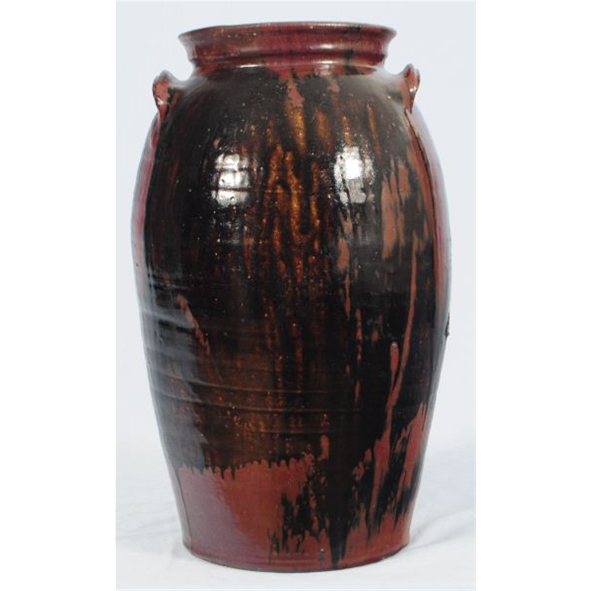 Large storage jar with exceptional red and ash glaze. Rusk County. John Leopard. 1860. Found in Powell, Texas, Navarro County, in the middle of a cotton patch by a drive. Owner stated it had been sitting there for many, many years. Has minor restoration to one section of the rim. All pieces are in the repair. Found in the early 1990s.