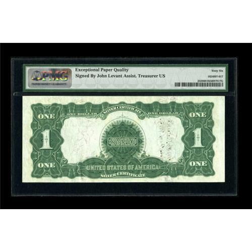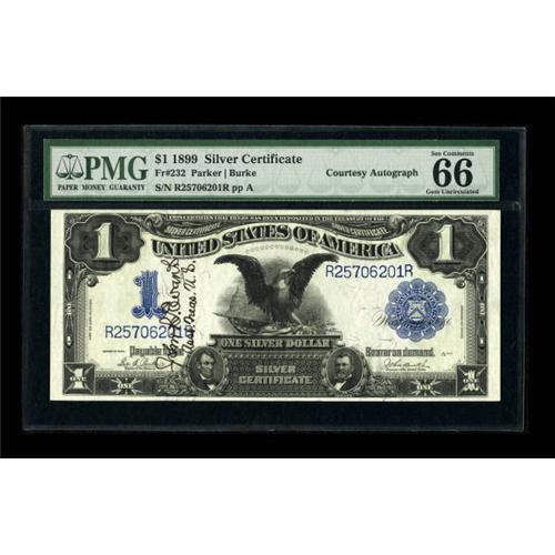 <B>John Levant Courtesy Autograph Fr. 232 $1 1899 Silver Certificate PMG Gem Uncirculated 66 EPQ.</B></I> Assistant Treasurer of the United States, John L. Levant, autographed this note with original paper surfaces. This is one of only two recorded notes of this Friedberg number that Levant autographed. <B>PMG Gem Uncirculated 66 EPQ.</B></I><BR><BR><b>Shipping:</b> Coins & Currency (<a target="_blank" href="http://www.heritageauctions.com/common/shipping.php">view shipping information</a>)