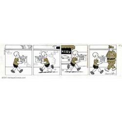 John Liney - Original Comic Strip Art for Henry dated 1-13-75 (King Features Syndicate, 1975). Carl Anderson created Henry, the little bald boy, in a illustration class he was teaching in 1932. His students loved the character so much that Anderson submitted him to the Saturday Evening Post, who also found him charming and, on March 19, 1932, made him a regular feature. Anderson drew the strip for the next ten years, until arthritis forced him to stop, and the strip was taken over by several assistants, including John Liney, who drew the piece offered here. The strip later transitioned into the daily newspapers, where it remains to this day. This strip, which measures approximately 22.5" x 6.75", with an image area of approximately 20.25" x 5.5", is rendered in pen and ink, with Zip-a-tone highlights, and is in excellent condition. It is signed by the artist in the last panel. Important notice: We expect to be auctioning lots at the rate of 200-250 per hour. Sometimes eBay Premier live bid software cannot keep up with that pace, so we strongly recommend that you place a realistic proxy bid now as insurance to avoid disappointment. Also please note that all Heritage/CAA lots purchased through eBay Premier carry a 20% Buyer's Premium. Please make sure you read the Terms and Conditions.