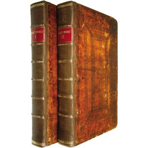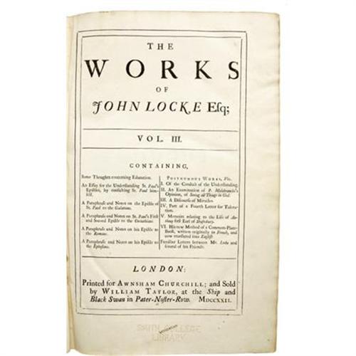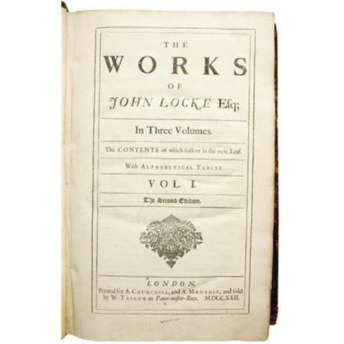<B>John Locke: </B></I><B><I>The Works of John Locke Esq</B></I></B></I><B>, Volume I and III of a Three Volume Set</B></I>. (London: A. Churchill and A. Manship, 1722), second edition, 575 and 668 pages respectively, indices, full page engraved portrait of Locke as <I>frontis</B></I> in volume I, period calf binding with tooled boards and gilt rules, modern rebacking incorporating six raised bands and red morocco spine labels with gilt titles, folio (8.25” x 12.5”), Smith College Library bookplates (withdrawn) on inside front boards, Smith College perforated stamp on each title page, penciled Dewey Decimal markings, small typed Locke biography affixed to inside rear cover of Volume I, internal contents bright, boards rubbed with some staining, corners bumped and frayed, front inside hinge of Volume I cracked but still tight, else very good. <BR><BR><b>Shipping:</b> Books & Catalogs (<a target="_blank" href="http://www.heritageauctions.com/common/shipping.php">view shipping information</a>)