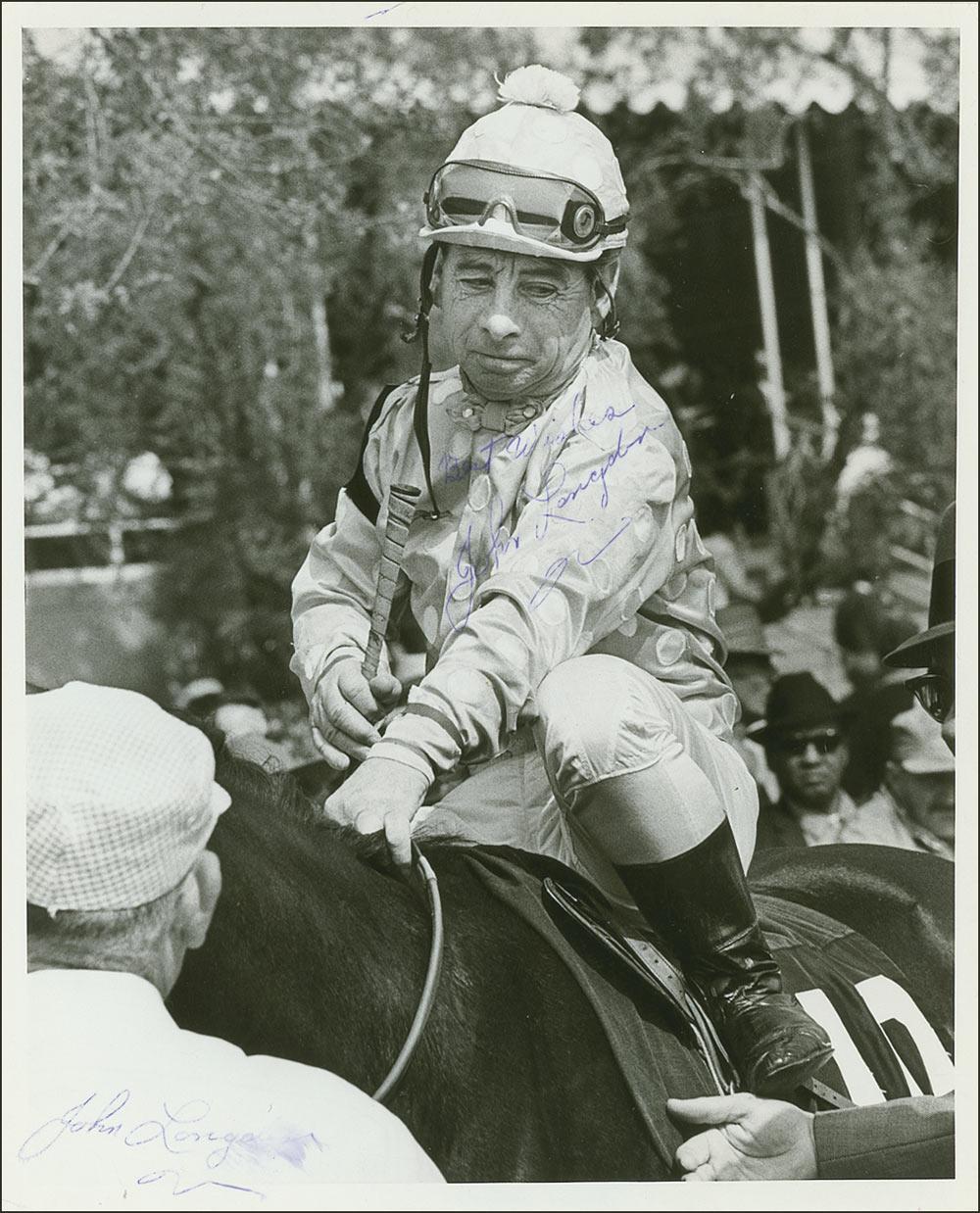 Racing Hall of Fame jockey (1907-2003). Vintage glossy 8 x 10 Los Angeles Times press photo of Longdon atop his mount before a race, signed in purple fountain pen, “Best wishes, John Longdon,” and also signed again in the lower left corner. Light irregular adhesion to signature in the center of image, and brushing to last name of lower signature, otherwise fine condition.