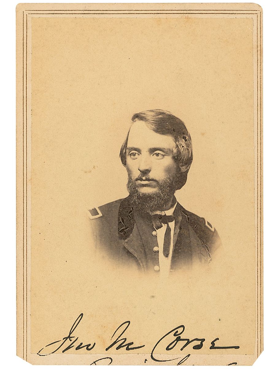 Union general (1835–1893) who participated in Sherman’s March to the Sea. Original 2.25 x 3.5 carte-de-visite photo by Morse’s Gallery of the Cumberland, signed at the bottom of the image in black ink, “Jn M Corse.” In fine condition, with trimmed bottom border and a bit of trivial silvering.