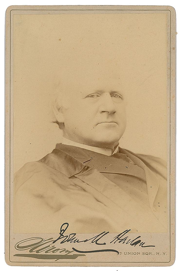 Uncommon 4.25 x 6.5 cabinet photo of Harlan in his judicial robe by Sarony of New York, boldly signed at the bottom in ink, "John M. Harlan." In fine condition.
