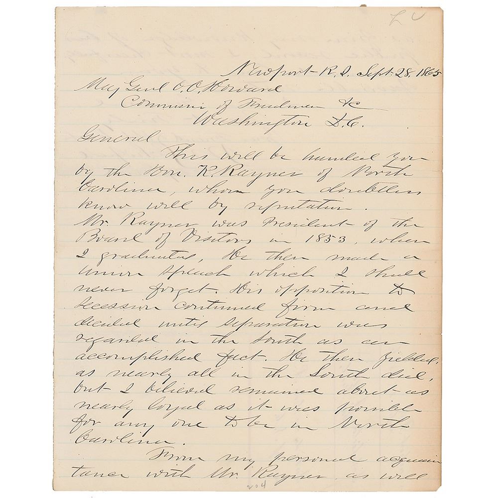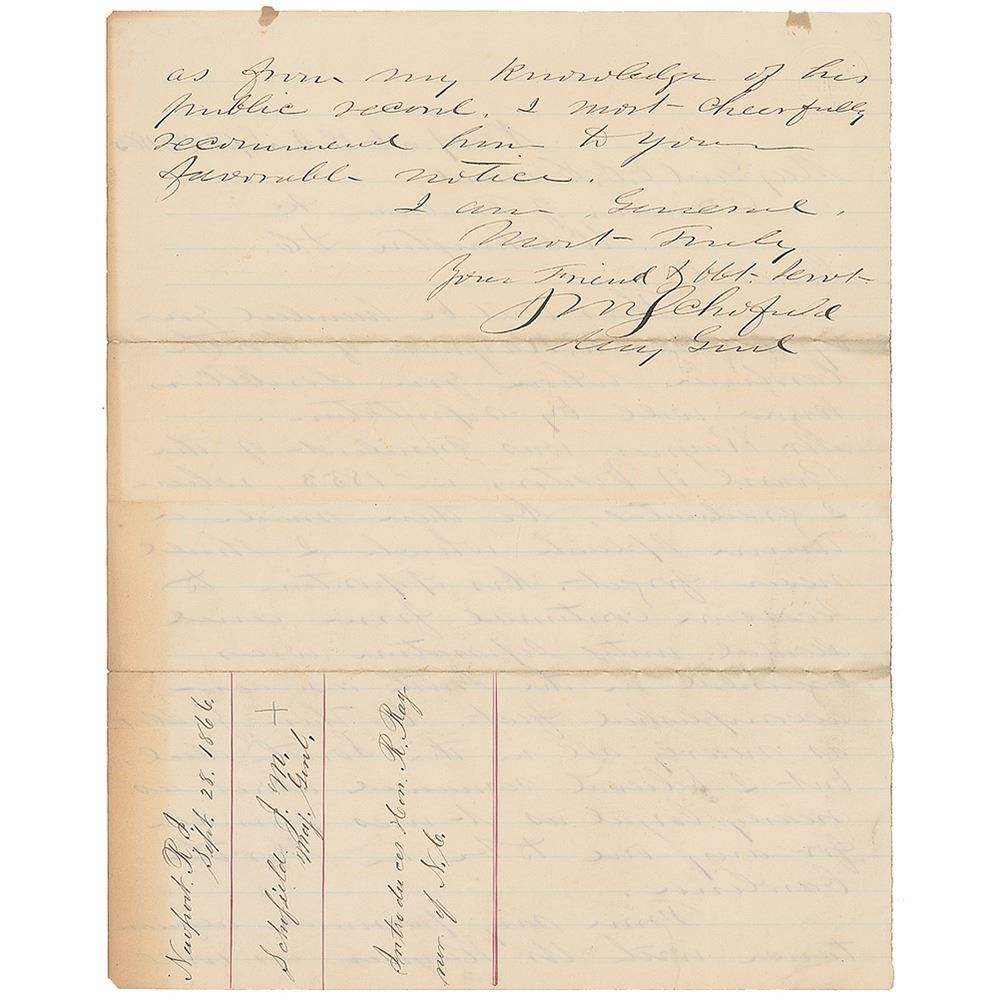 ALS signed “J. M. Schofield, Maj. Gen'l,†one page both sides, 8 x 10, September 28, 1866. Letter to Union General Oliver Otis Howard, in full: "This will be handed you by the Hon. R. Rayner of North Carolina, whom you doubtless know well by reputation. Mr. Rayner was president of the Board of Visitors in 1853, when I graduated. He then made a Union speech which I shall never forget. His opposition to secession continued firm and decided until separation was regarded in the South as an accomplished fact. He then yielded as nearly all in the South did, but I believed remained about as nearly loyal as it was possible for any one to be in North Carolina. From my personal acquaintance with Mr. Rayner as well as from my knowledge of his public record, I most cheerfully recommend him to your favorable notice." In fine condition. Kenneth Rayner (1808–1884), a planter, lawyer, and Whig politician from North Carolina, opposed both slavery and secession. He served in the U.S. House of Representatives between 1839 and 1845, and his passionate speeches alienated fellow Southerners.