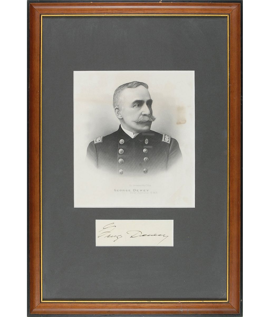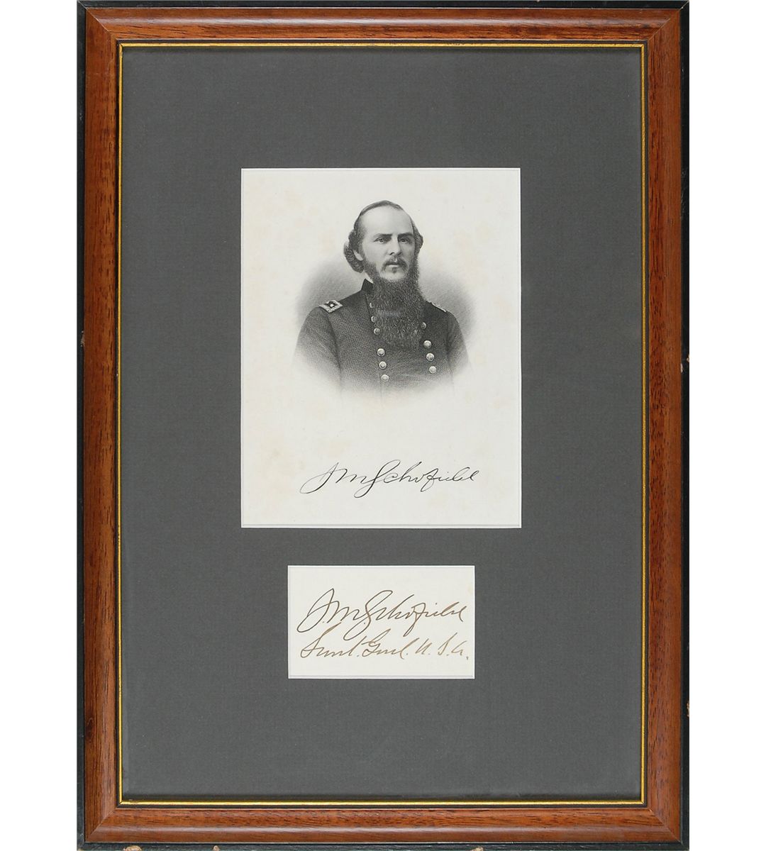 Nicely displayed ink signatures, “J. M. Schofield, Lieut. Genl. U. S. A.” and “George Dewey,” on off-white slips. Individually matted and framed with unsigned engraved portraits of the military heroes to overall sizes of 11 x 16. In overall fine condition.