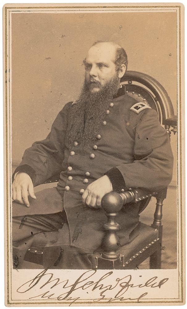 Union general (1831–1906) who served as army commander in Sherman’s Atlanta campaign and who later became general-in-chief of the army. Original 2.25 x 4 carte-de-visite portrait of Schofield seated, by E. & H. T. Anthony of New York, signed in the lower border in black ink, “J. M. Schofield, Maj. Genl.” In fine condition, with light scattered surface marks.