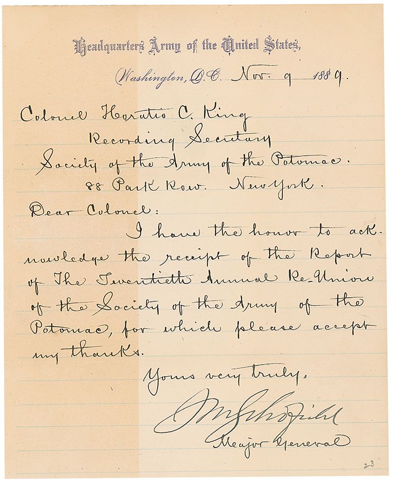 Union general (1831–1906) who served as army commander in Sherman’s Atlanta campaign and who later became General-in-chief of the army. LS signed “J. M. Schofield,” one page, lightly-lined, 7 x 8.5, Headquarters Army of the United States letterhead, November 9, 1889. Letter to Colonel Horatio King at the Society of the Army of the Potomac. In full: “I have the honor to acknowledge the receipt of the Report of the Twentieth Annual Re-Union of the Society of the Army of the Potomac, for which please accept my thanks.” In very good condition, with intersecting folds, one through a single letter of signature, and toning to left side of letter.
