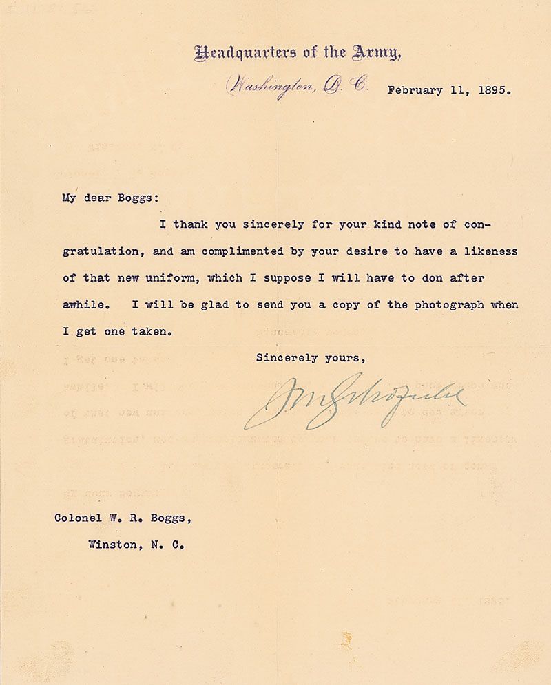 Union general (1831–1906) who served as army commander in Sherman’s Atlanta campaign and who later became general-in-chief of the army. TLS signed “J. M. Schofield,” one page, 8 x 10, Headquarters of the Army letterhead, February 11, 1895. Letter to Colonel W. R. Boggs. In full: “I thank you sincerely for your kind note of congratulation, and am complimented by your desire to have a likeness of that new uniform, which I suppose I will have to don after awhile. I will be glad to send you a copy of the photograph when I get one taken.” Central vertical and horizontal folds (vertical fold passing through a single letter of the signature), and a spot of soiling to the lower border, otherwise fine condition.