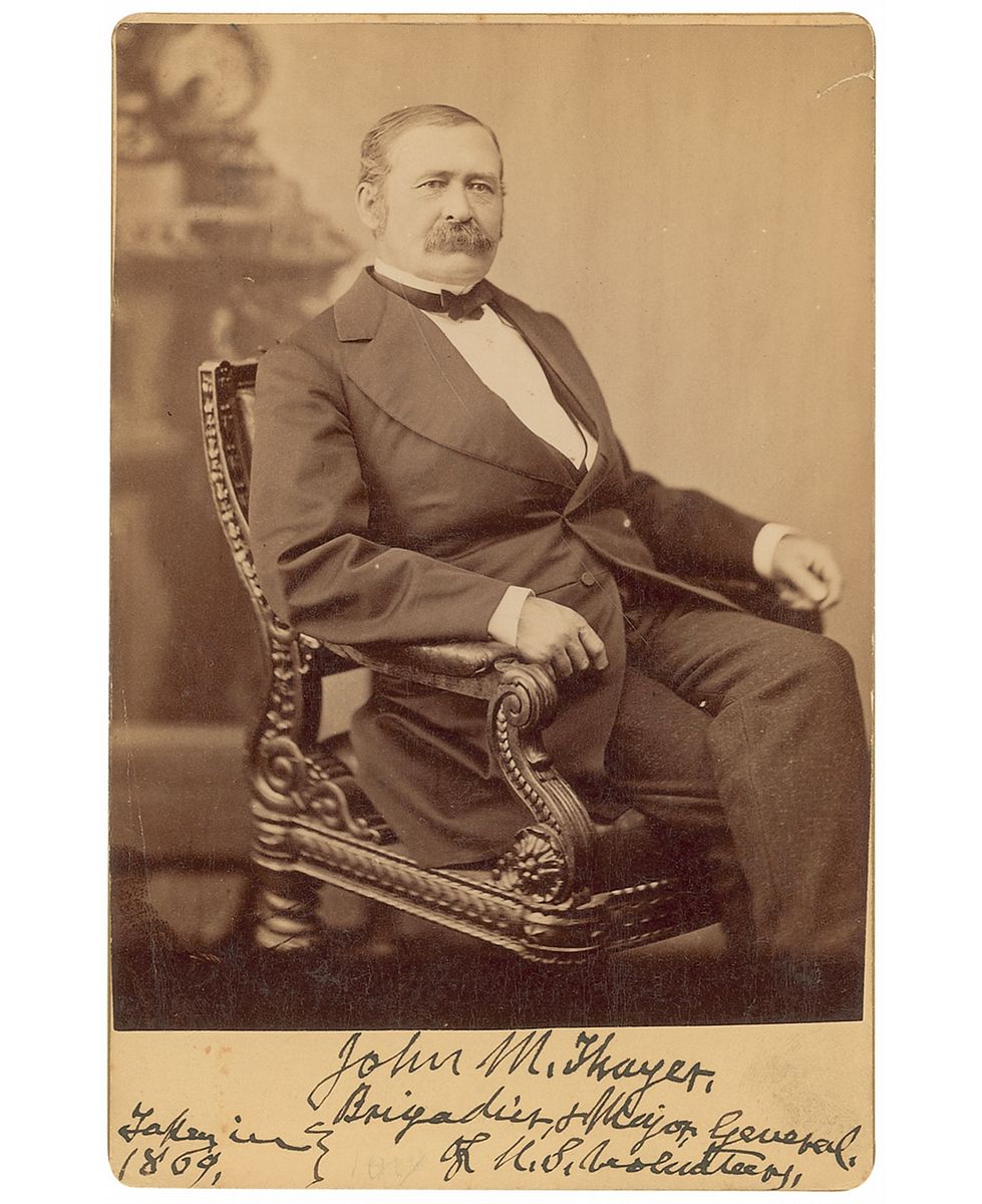 Union general (1820–1906) and US Senator from Nebraska. Original 4 x 6.5 cabinet photo by an anonymous studio, signed in the lower border in black ink, “John M. Thayer, Brigadier & Major General of U.S. Volunteers, Taken in 1869.” In fine condition, with some slight crazing to image, a few surface marks, and a bit of light soiling and a fingerprint to bottom border.