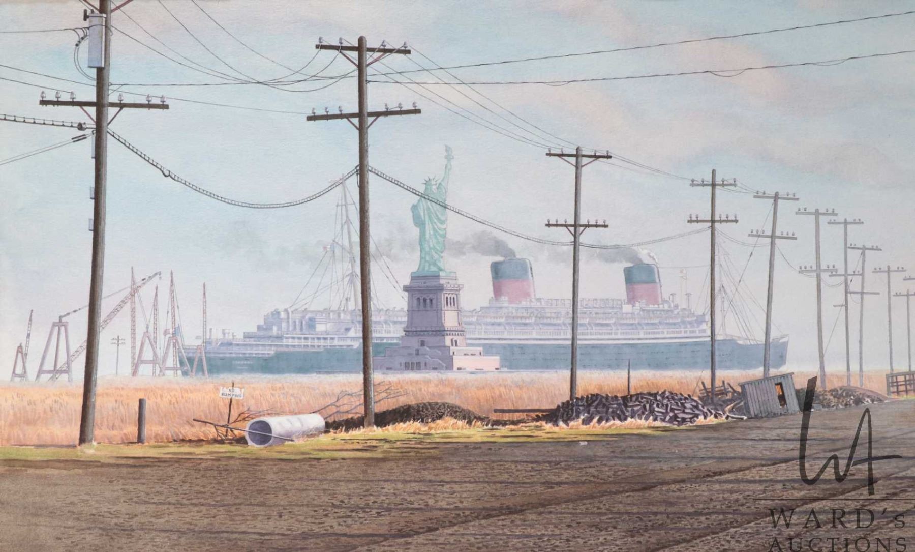 John M. Zupan (1941-1998) unsigned and unframed original watercolour of the backside of the Statue of Liberty with steam ship. From the estate of the artist, presumed to be his work, 12" X 20"