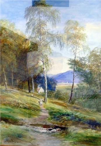 John MacWhirter, R.A., H.R.S.A., R.I., (1839-1911) British, Watercolour, View of a Sunlit Valley Through Birchgrove", signed lower left, "MacW", 30" x 21"