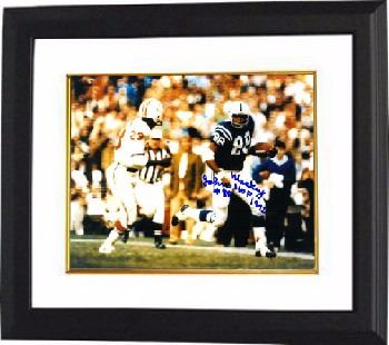 In 1963, John Mackey joined the Colts and by 1966, had revolutionized the position of tight end in the NFL. Twice Mackey compiled season averages of more than 20 yards a catch, and his 10-year career average of 15.8 is considered remarkable for a tight end. John Mackey has hand autographed this Baltimore Colts 8x10 Photo with HOF 1992 #88 inscription. Certificate of Authenticity from Athlon Sports. Custom White Mat and Premium Black Frame as shown.
