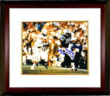In 1963, John Mackey joined the Colts and by 1966, had revolutionized the position of tight end in the NFL. Twice Mackey compiled season averages of more than 20 yards a catch, and his 10-year career average of 15.8 is considered remarkable for a tight end. John Mackey has hand autographed this Baltimore Colts 8x10 Photo with HOF 1992 #88 inscription. Certificate of Authenticity from Athlon Sports. Custom White Mat and Premium Black Frame as shown.