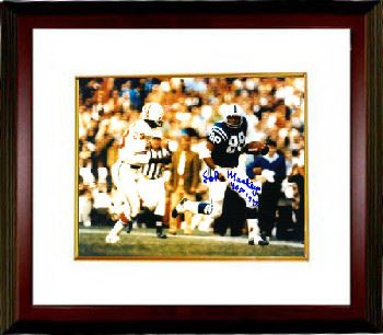 In 1963, John Mackey joined the Colts and by 1966, had revolutionized the position of tight end in the NFL. Twice Mackey compiled season averages of more than 20 yards a catch, and his 10-year career average of 15.8 is considered remarkable for a tight end. John Mackey has hand autographed this Baltimore Colts 8x10 Photo with HOF 1992 inscription. Certificate of Authenticity from Athlon Sports. Custom White Mat and Premium Mahogany Frame as shown.