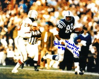 In 1963, John Mackey joined the Colts and by 1966, had revolutionized the position of tight end in the NFL. Twice Mackey compiled season averages of more than 20 yards a catch, and his 10-year career average of 15.8 is considered remarkable for a tight end. John Mackey has hand autographed this Baltimore Colts 8x10 Photo with HOF 1992 #88 inscription. Certificate of Authenticity from Athlon Sports.