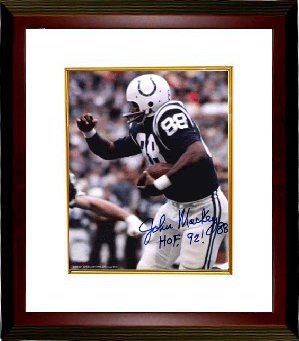 In 1963, John Mackey joined the Colts and by 1966, had revolutionized the position of tight end in the NFL. Twice Mackey compiled season averages of more than 20 yards a catch, and his 10-year career average of 15.8 is considered remarkable for a tight end. John Mackey has hand autographed this Baltimore Colts 8x10 Photo with HOF inscription. Certificate of Authenticity from Athlon Sports. Custom White Mat and Premium Mahogany Frame as shown.