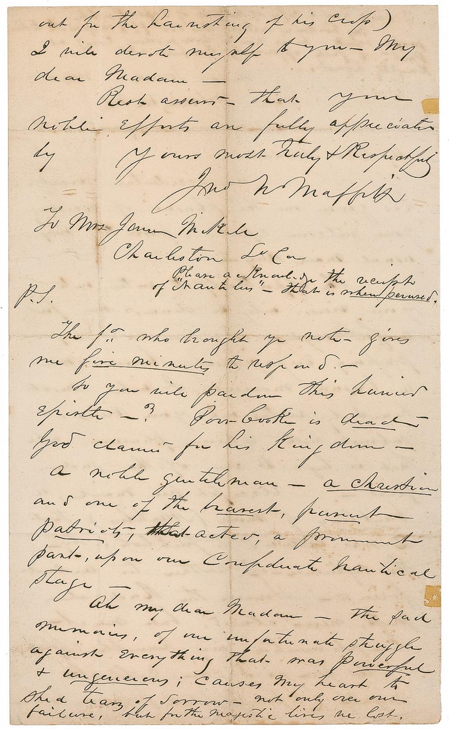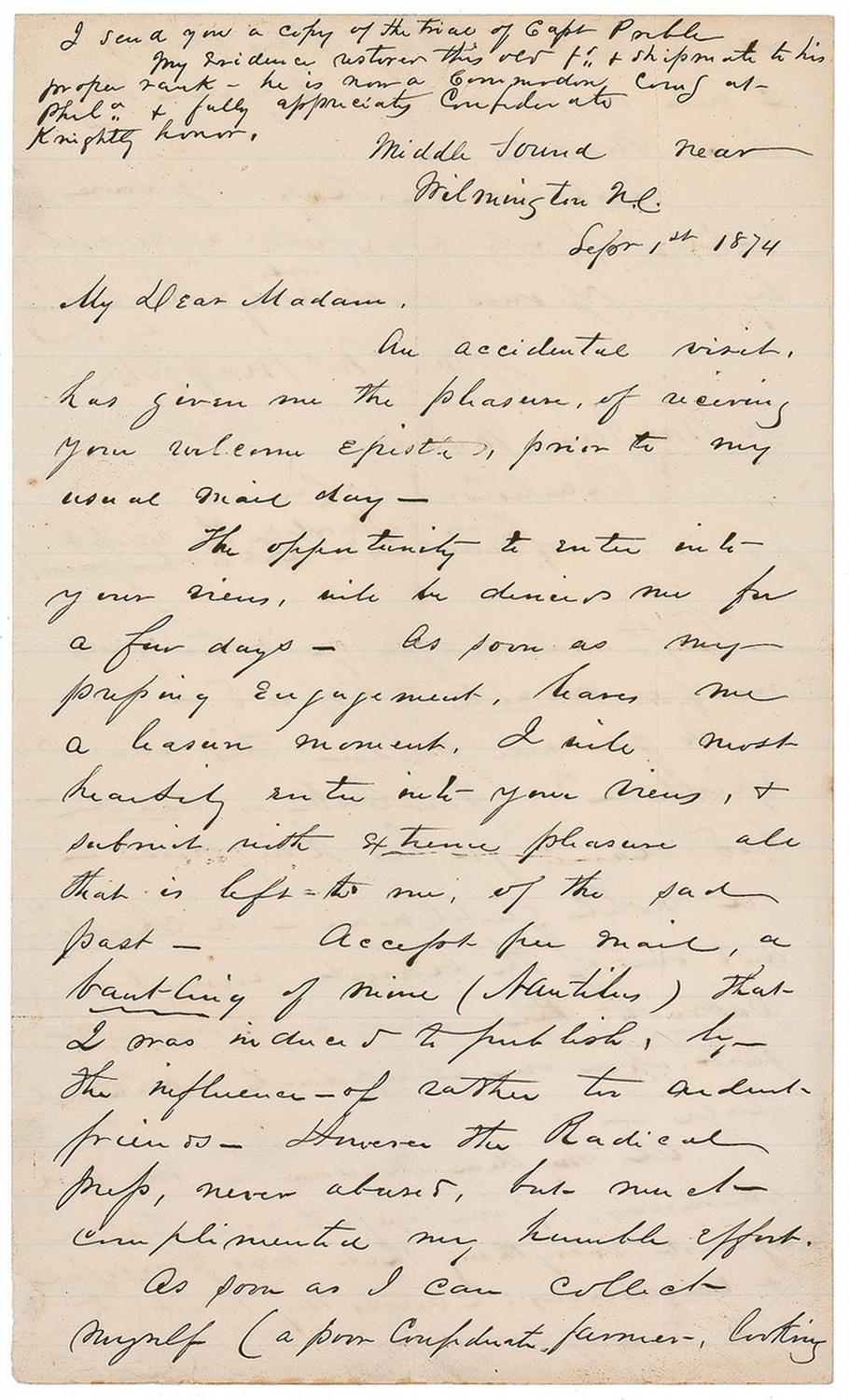 Charismatic commander of the Confederate cruiser ‘Florida,’ whose depredations against Northern shipping were exceeded only by the famed ‘Alabama.’ ALS signed “Jno. N. Maffitt,” on both sides of one lightly-lined page, 5.5 x 9, September 1, 1874. Letter to a lady in South Carolina accepting an invitation for a visit and reflecting on the late war. In part: “As soon as my passing engagement leaves me a…moment, I will most heartily…submit with extreme pleasure all that is left to me of the sad past…As soon as I can collect myself (a poor Confederate farmer, looking out for…his crop).” In his postscript, Maffitt writes, in part: “Ah my dear madam, the sad memories of our unfortunate struggle against everything that was powerful and ungenerous; causes my heart to shed a tear of sorrow—not only over our failure, but for the majestic lives we lost.” Also at the top of the front page, Maffitt writes that his testimony before a Navy court “restored this old fr. & shipmate to his proper rank…he…fully appreciates Confederate knightly honor.” In very good condition, with intersecting folds, scattered toning, a bit heavier to back, as well as a few old tape remnants to back right edge.
