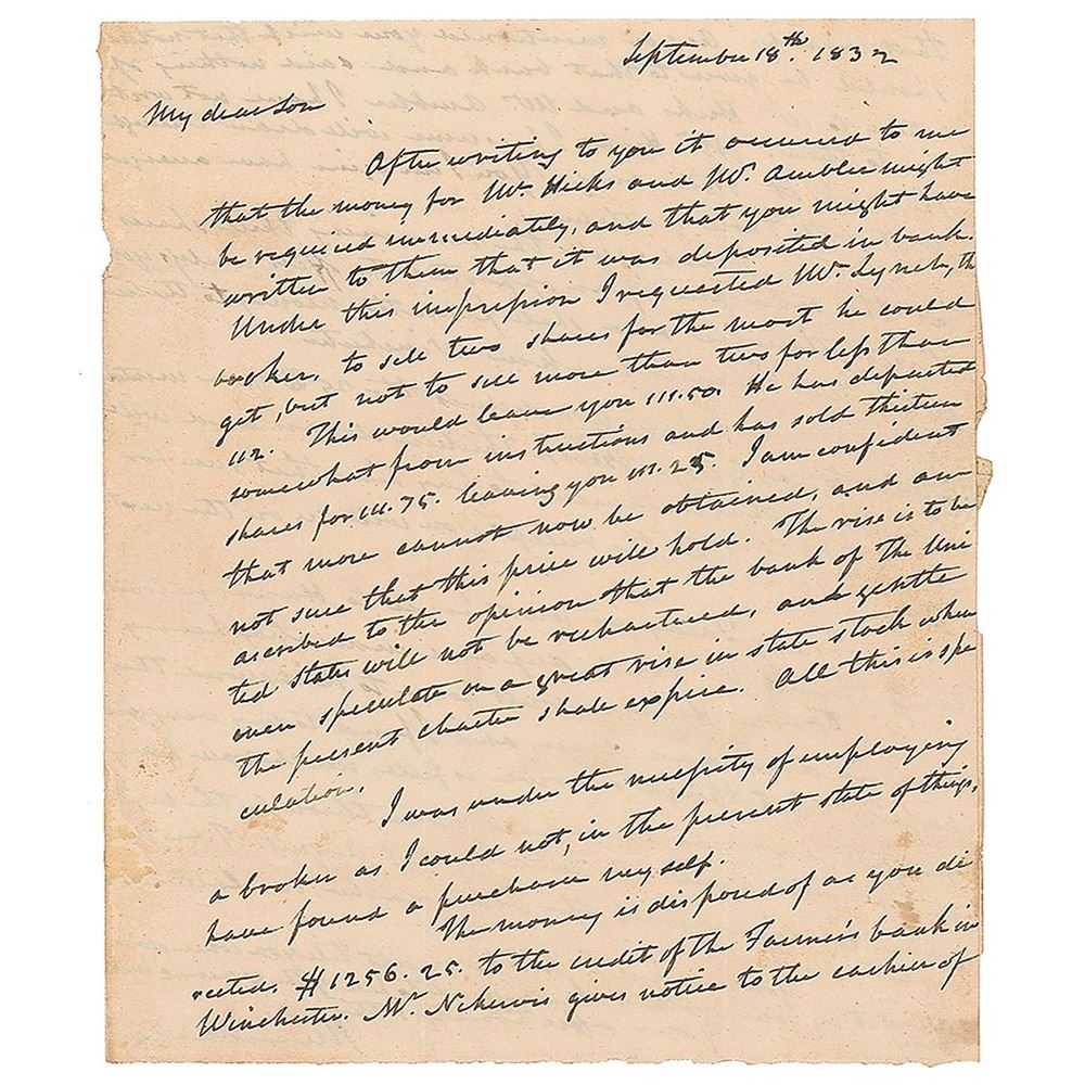 ALS signed “J. Marshall,†one page both sides, 6.25 x 7.5, September 18, 1832. Letter to his son, James K. Marshall, concerning the sale of some bank stock. In part: "After writing to you it occured to me that the money for Mr. Hicks and Mr. Ambler might be required immediately, and that you might have written to them that it was deposited in the bank. Under this impression I requested Mr. Lynch, the broker, to sell two shares for the most he could get, but not to sell more than two for less than 112…He has departed somewhat from instructions and has sold thirteen shares for 111.75…I am confident that more cannot now be obtained, and am not sure that this price will hold. The rise is to be ascribed to the opinion that the bank of The United States will not be rechartered, and gentlemen speculate on a great rise in state stock when the present charter shall expire. All this is speculation…I shall sell the remaining three shares at the same price if an opportunity offers unless you direct otherwise, and shall place the money to the credit of the Farmer's bank in Winchester." Addressed on the integral leaf in Marshall's hand. In very good to fine condition, with a tear to the left edge, scattered light stains, and damage to the integral address leaf, including a tear and the top third trimmed off and not present.