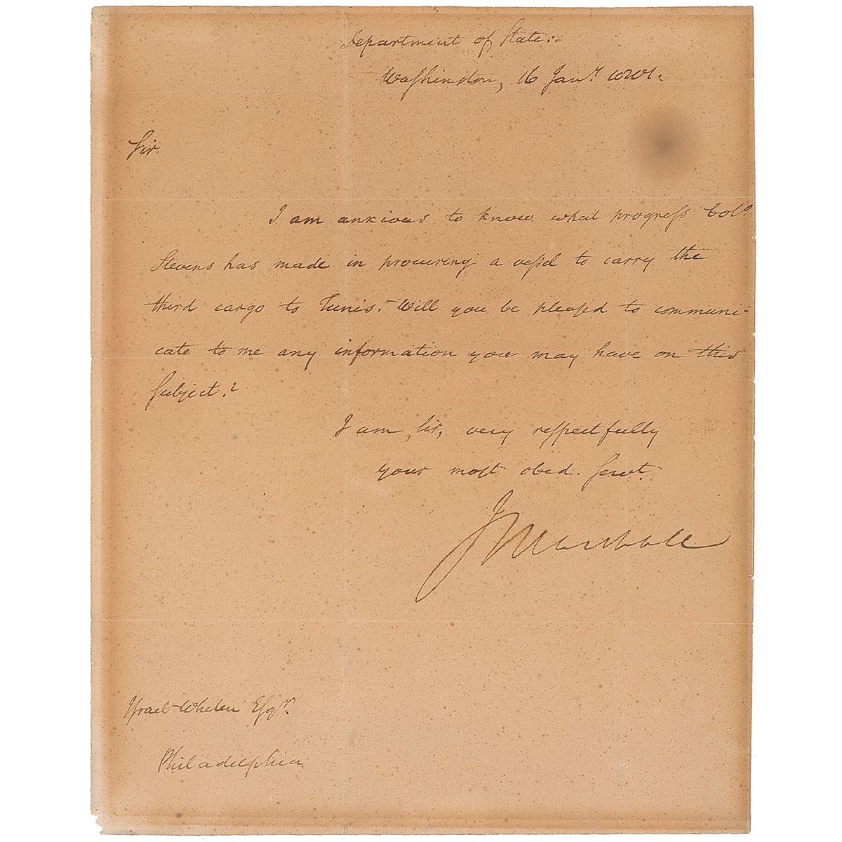 Influential American statesman and jurist (1755–1835) who served as the fourth Chief Justice of the Supreme Court. Among the notable cases over which Marshall presided were the judicial review landmark Marbury v. Madison in 1803, and the 1807 trial of Aaron Burr for treason. LS signed “J. Marshall,” one page, 8 x 10, January 16, 1801. Letter to Israel Wheeler of Philadelphia. In full: “I am anxious to know what progress Col. Stevens has made in procuring a vessel to carry the third cargo to Tunis. Will you be pleased to communicate to me any information you may have on this subject?” In very good condition, with intersecting folds (slight edge separations to lower horizontal fold; one vertical fold passing through a single letter of the signature), overall toning from previous display, and a circular stain to blank area in upper right. Accompanied by an unsigned engraved portrait. Marshall, who was secretary of state at the time of writing, assumed office as chief justice less than three weeks later, on February 4.