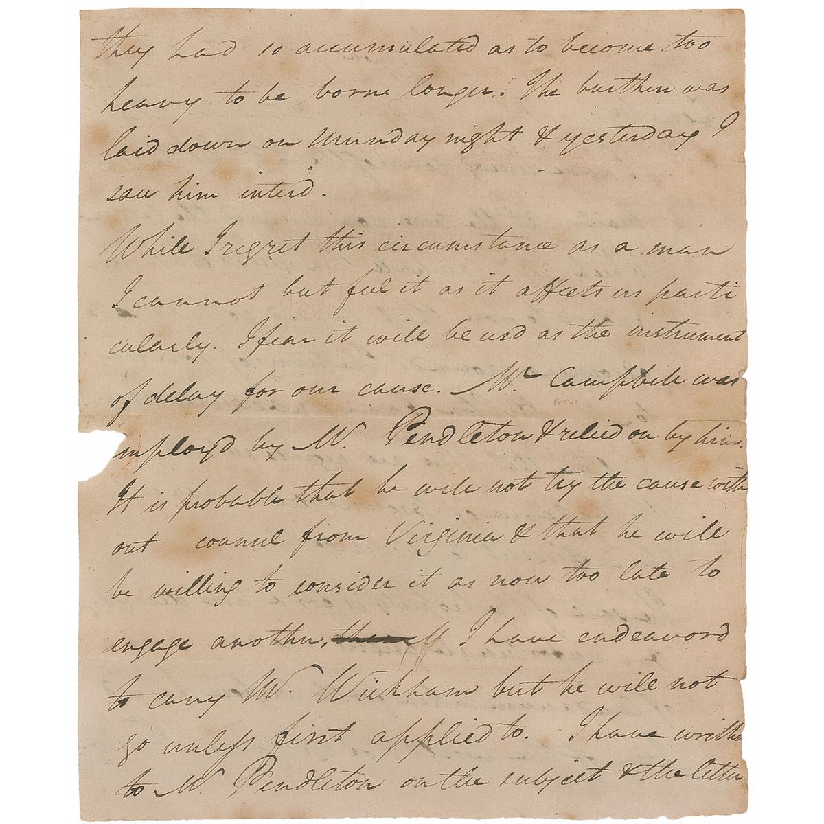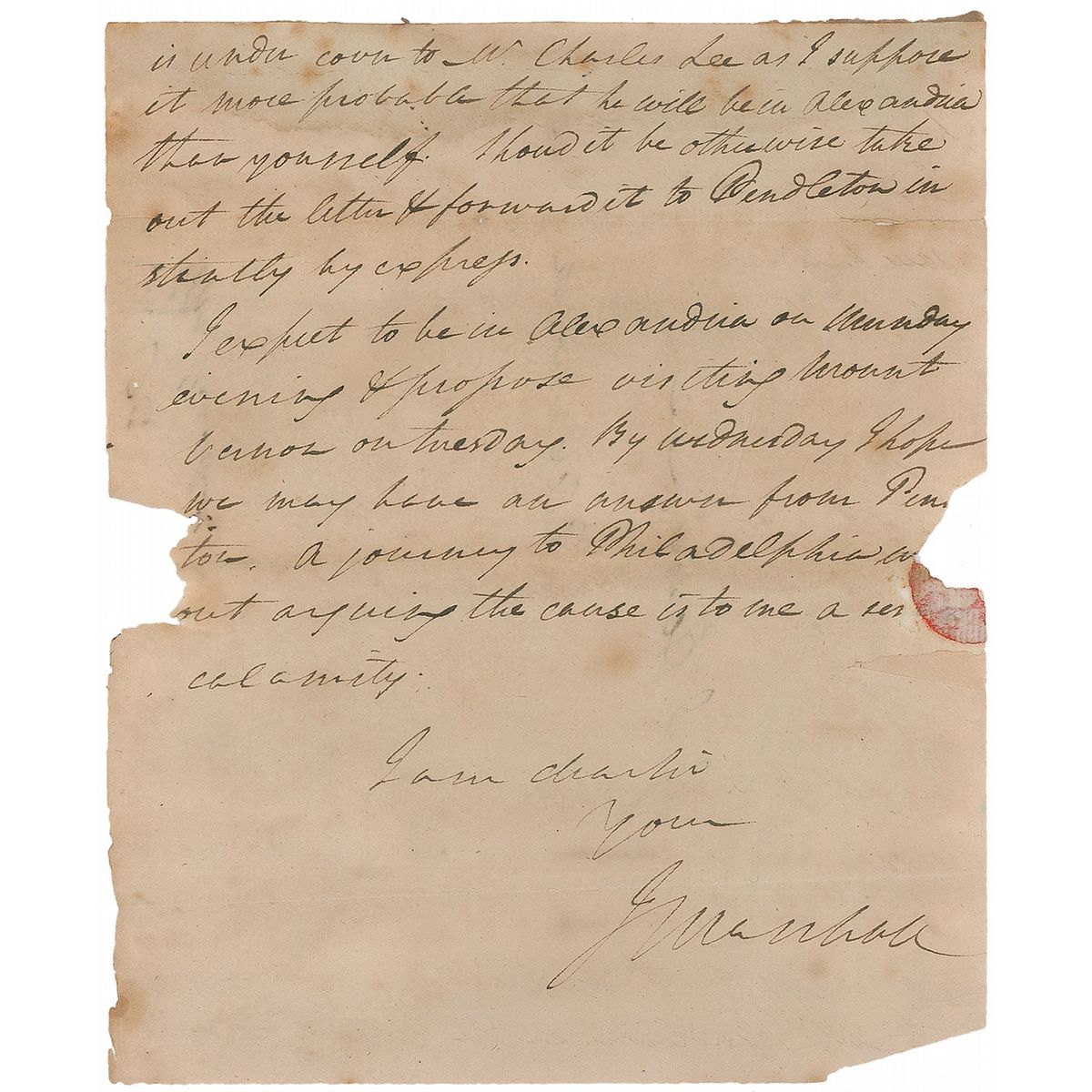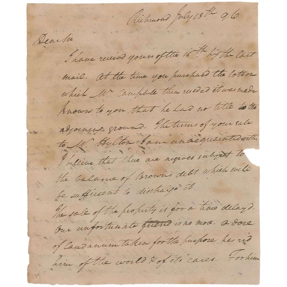 ALS signed “J. Marshall,” three pages on two formerly adjoining sheets, 6.25 x 8, July 18, 1796. Letter to General Henry 'Light-Horse Harry' Lee, father of Robert E. Lee. In full: “I have received yours of the 15th by the last mail. At the time you purchased the lott on which Mr Campbell then resided it was made known to you that he had no title to the adjoining ground. The terms of your sale to Mr Hylton I am unacquainted with. I believe that there are negroes subject to the balance of Browns debt which will be sufficient to discharge it. The sale of the property is for a time delayed. Our unfortunate friend is no more. A dose of Laudanum taken for the purpose has rid him of the world & of its cares. For him they had so accumulated as to become too heavy to be borne longer. The burthen was laid down on Monday night & yesterday I saw him inter[re]d. While I regret this circumstance as a man I cannot but feel it as it affects us particularly. I fear it will be us[e]d as the instrument of delay for our cause. Mr Campbell was employed by Mr Pendleton & relied on by him. It is probable that he will not try the cause without counsel from Virginia & that he will be willing to consider it as now too late to engage another. I have endeavor[e]d to carry Mr Wickham but he will not go unless applied to. I have written to Mr Pendleton on the subject & the letter is under cover to Mr Charles Lee as I suppose it more probable that he will be in Alexandria than yourself. Shou[l]d it be otherwise take out the letter & forward it to Pendleton instantly by express. I expect to be in Alexandria on Monday evening & propose visiting Mount Vernon on Tuesday. By Wednesday I hope we may have an answer from Pendleton. A journey to Philadelphia w[ith]out arguing the cause is to me a serious calamity.” In very good condition, with some paper loss along edges from wax seal, slightly affecting small portions of a few words of text, scattered toning, and intersecting folds, one through a single letter of signature.