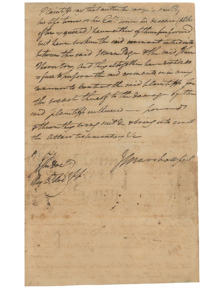 Influential American statesman and jurist (1755–1835) who served as the fourth Chief Justice of the Supreme Court. ADS, signed “J. Marshall for P,” three pages on two adjoining sheets, 7.25 x 12, no date but circa August 1785. Marshall outlines at length John Thornton’s case against John Page in a suit over an unpaid debt from an estate for which Page was the executor. Several areas of professionally repaired paper loss affecting substantial portions of the text on the first two pages (the “for P” portion of the signature slightly affected by a repaired edge tear), and show-through from writing to opposing sides, otherwise very good condition.