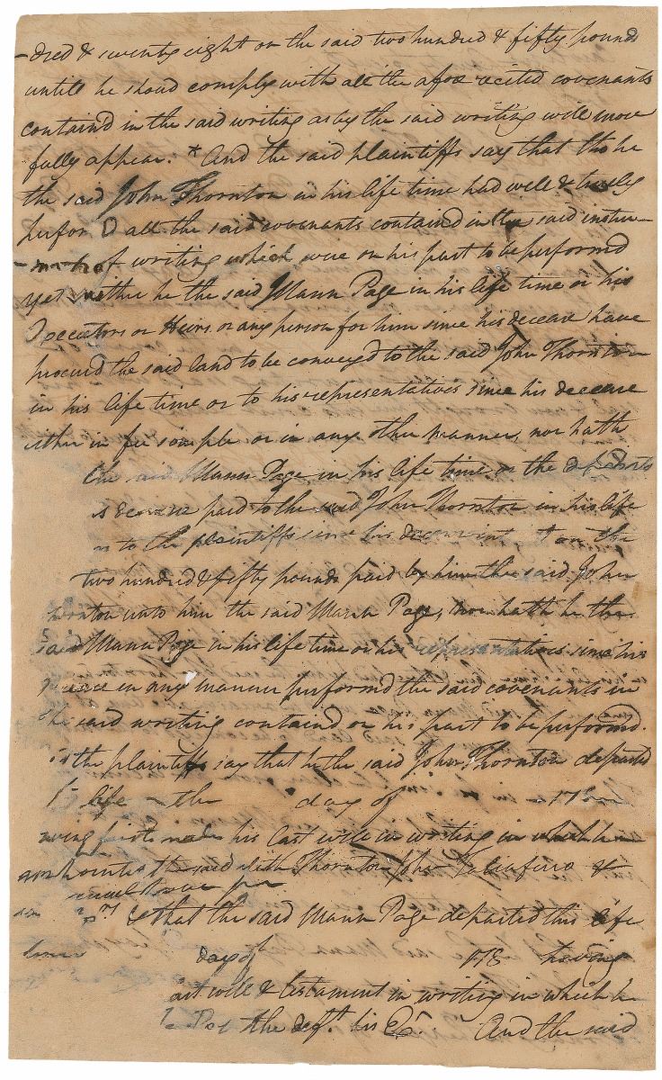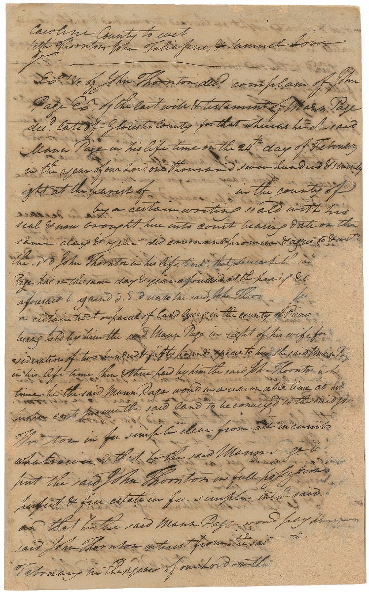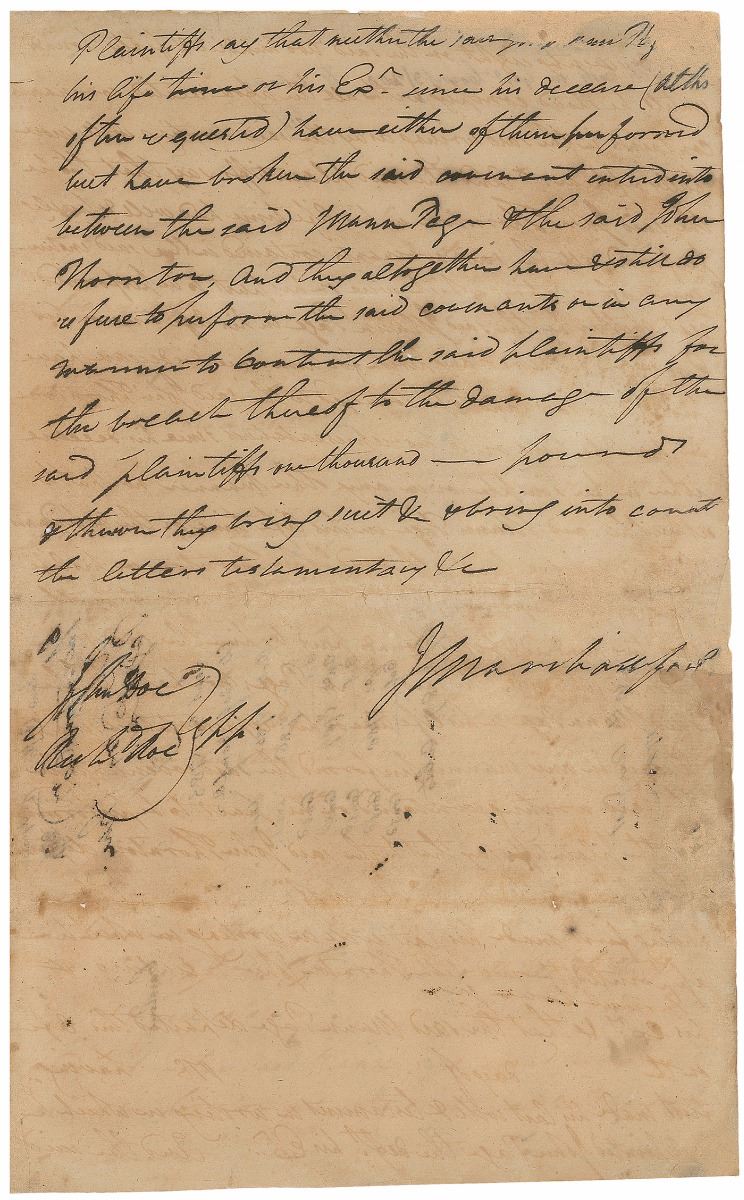 Influential American statesman and jurist (1755–1835) who served as the fourth Chief Justice of the Supreme Court. ADS, signed “J. Marshall for P,” three pages on two adjoining sheets, 7.25 x 12, no date but circa August 1785. Marshall outlines at length John Thornton’s case against John Page in a suit over an unpaid debt from an estate for which Page was the executor. Several areas of professionally repaired paper loss affecting substantial portions of the text on the first two pages (the “for P” portion of the signature slightly affected by a repaired edge tear), and show-through from writing to opposing sides, otherwise very good condition.
