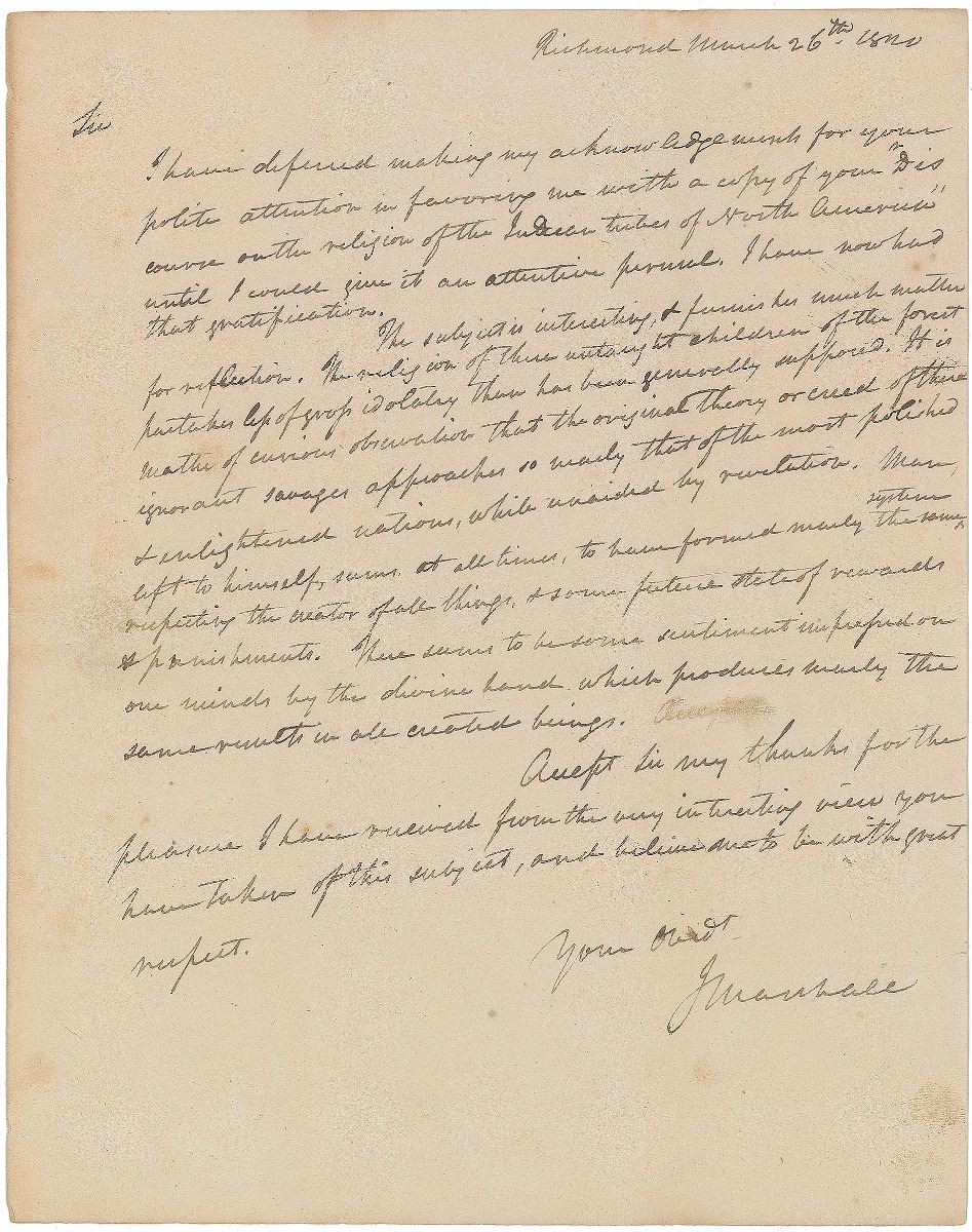 Marshall’s court would go on to establish the framework for relations between the federal government and America’s indigenous peoples; it is possible that his understanding of Native American religion gleaned from this discourse went on to inform the court’s decisions. In his landmark Johnson v. M'Intosh ruling of 1823, Marshall cites the ‘principles of abstract justice which the Creator of all things has impressed on the mind of his creature man’—very nearly the same language he uses at the conclusion of this letter.