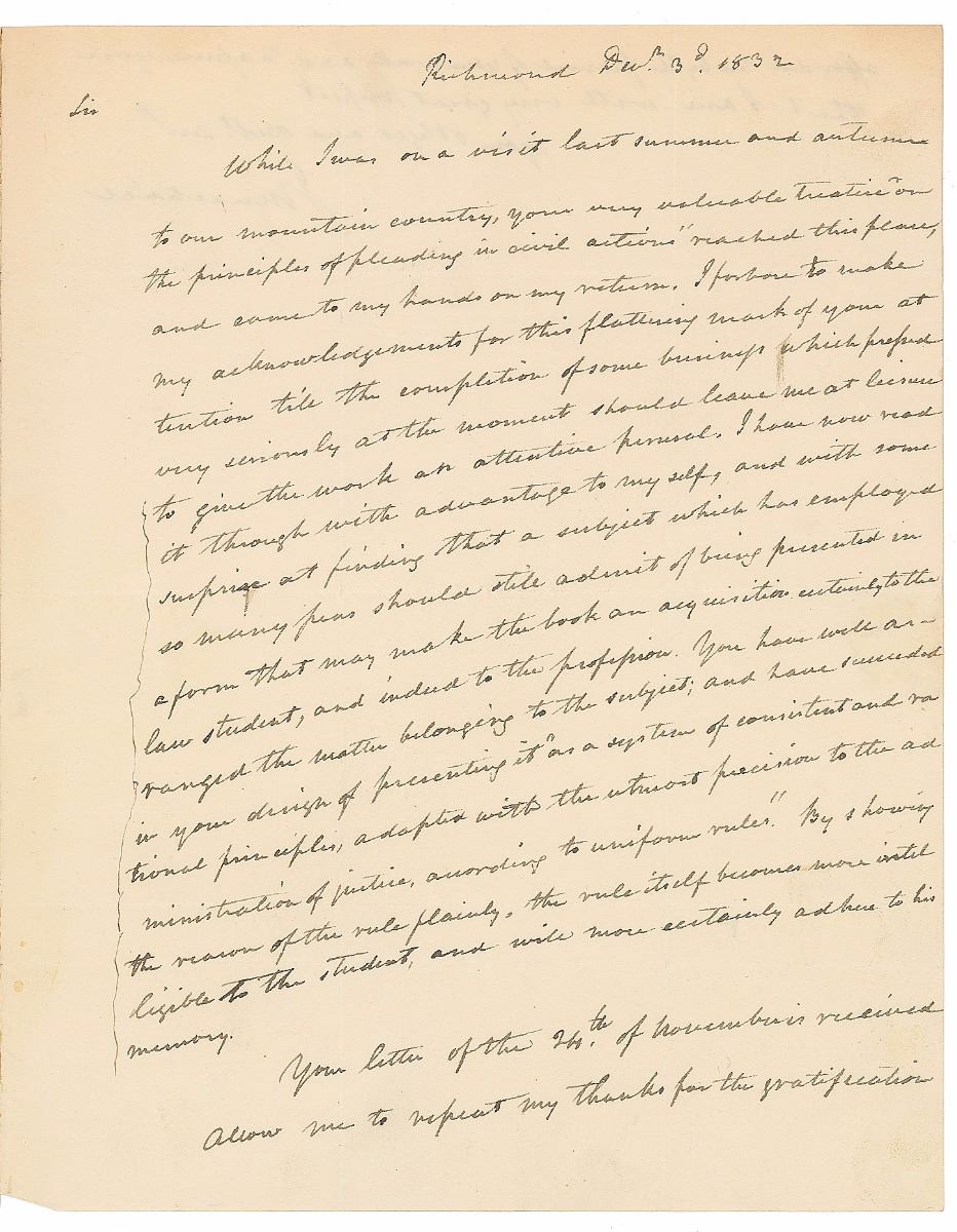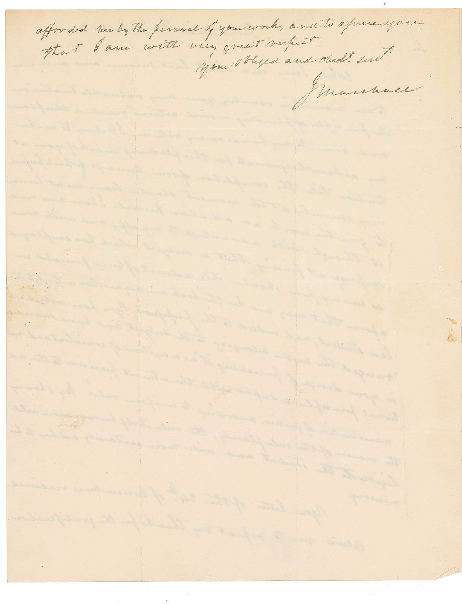 Choice ALS signed “J. Marshall,” one page both sides, 8 x 10, December 3, 1832. Letter to James Gould, at Litchfield Law School in Connecticut. In part: “Your very valuable treatise ‘on the principles of pleading in civil actions’ reached this place, and came to my hands on my return…I have now read it through…you have well arranged the matter belonging to the subject; and have succeeded in your design of presenting it ‘as a system of consistent and rational principles, adopted with the utmost precision to the administration of justice, according to uniform rules.’ By showing the reason of the rule plainly, the rule itself becomes more intelligible to the student, and will more certainly adhere to his memory…my thanks for the gratification afforded me by the perusal of your work.” Addressed on the reverse of the second integral page in Marshall’s hand. In fine condition, with intersecting folds and some paper loss and mounting remnants to second integral address leaf. A wonderfully preserved letter boasting excellent legal content written while serving as chief justice of the Supreme Court. Provenance: The Everett Fisher Collection.