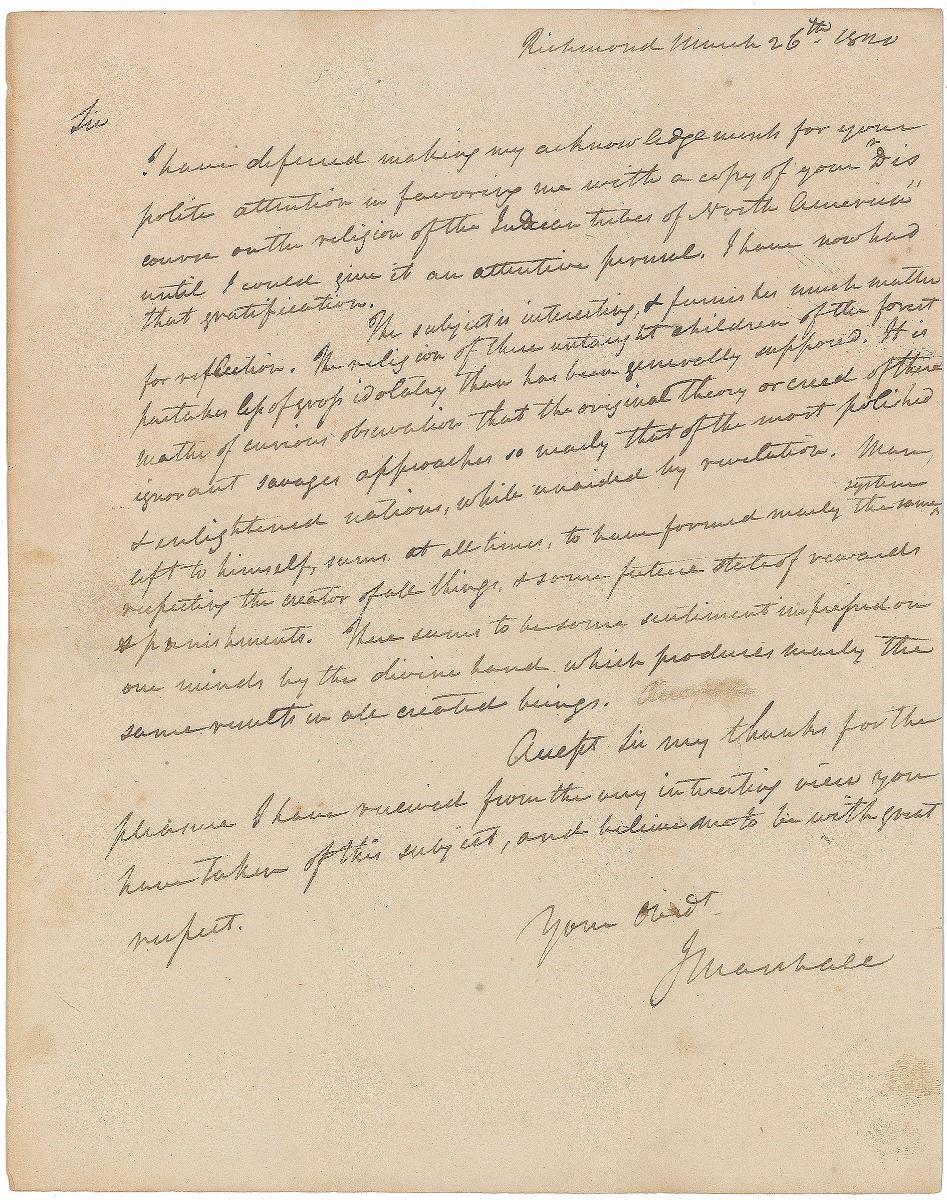 ALS signed “J. Marshall,” one page, 7.75 x 10, March 26, 1820. Thoughtful letter to Samuel Farmar Jarvis, a professor of Biblical learning at the New York General Theological Seminary. In part: “I have deferred making my acknowledgments for your polite attention in favoring me with a copy of your ‘Discourse on the religion of the Indian tribes of North America’...The religion of these untaught children of the forest partakes less of group idolatry than has been generally supposed. It is a matter of curious observation that the original theory or creed of these ignorant savages approaches so nearly that of the most polished & enlightened nations, while unaided by revelation. Man, left to himself, seems, at all times, to have formed nearly the same systems reflecting the creator of all things, & some future state of rewards & punishments. There seems to be some sentiment impressed on our minds by the divine hand which produces nearly the same results in all created beings.” Addressed on the reverse of the second integral page in Marshall’s hand. In fine condition. Provenance: The Everett Fisher Collection.