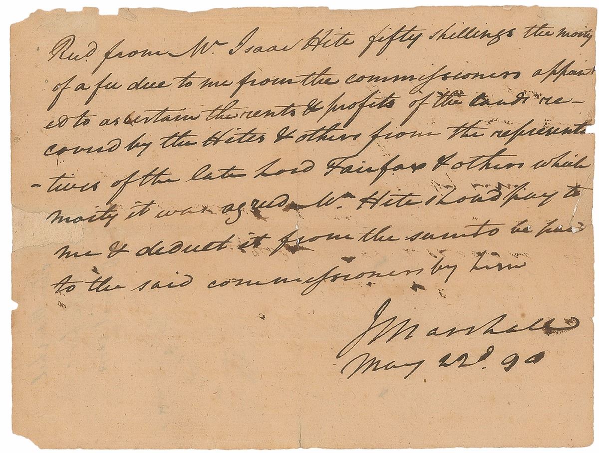 ADS, signed “J. Marshall,” one page, 7.25 x 5.5, May 22, 1790. A financial document. In full: “Recd from Mr. Isaac Hite fifty shillings the moity of a fee due to me from the commissioners appointed to ascertain the rents & profits of the lands recovered by the Hites & others from the representatives of the late Lord Fairfax & others which moity it was agreed Mr. Hite should pay to me & deduct it from the sum to be paid to the said commissioners by him.” In very good condition, with small repaired edge separations to intersecting folds, an area of repaired paper loss to the left edge with two affected letters filled in, chipping to edges, and a bit of brushing and mirroring to ink. Accompanied by an engraved portrait.