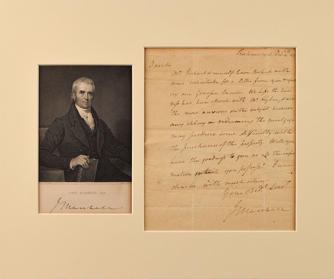 Influential American statesman and jurist (1755–1835) who served as the fourth Chief Justice of the Supreme Court. Among the notable cases over which Marshall presided were the judicial review landmark Marbury v. Madison (1803) and the 1807 trial of Aaron Burr for treason. ALS signed “J. Marshall,” one page, 6 x 7.25, December 4, 1817. Letter to Thomas Morris in New York, in part: "Mr. Richard and myself have looked with some solicitude for a letter from you respecting our Genesee lands. We hope the business has been closed with Mr. Higbee, & all the more anxious on the subject because any delay in redeeming the mortgage may produce some difficulty with the purchasers of the property. Will you have the goodness to give us all the information which you possess." Matted with an engraved portrait (bearing a facsimile signature) to an overall size of 13 x 11. In very good to fine condition, with overall creasing and intersecting folds.