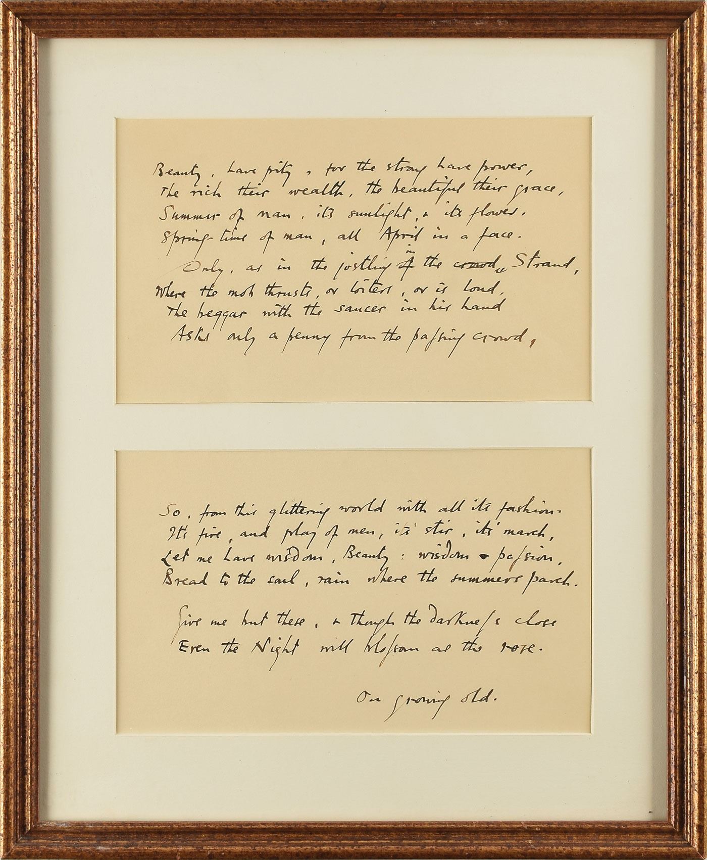 Unsigned handwritten poem by John Masefield, two pages, each measuring 10 x 6, handsomely matted and framed together to an overall size of 14.5 x 18. Masefield pens the closing stanzas of his poem "On Growing Old," concluding: "Let me have wisdom, Beauty: wisdom & passion, / Bread to the soul, rain when the summers parch. / Give me but these, and though the darkness close / Even the Night will blossom as the rose." In fine condition.
