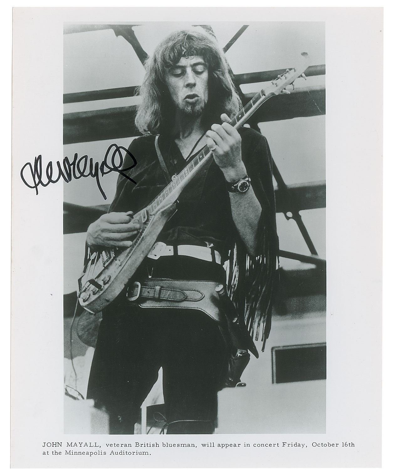 Glossy 8 x 10 publicity photo of Mayall playing his guitar, signed in black felt tip. In fine condition.