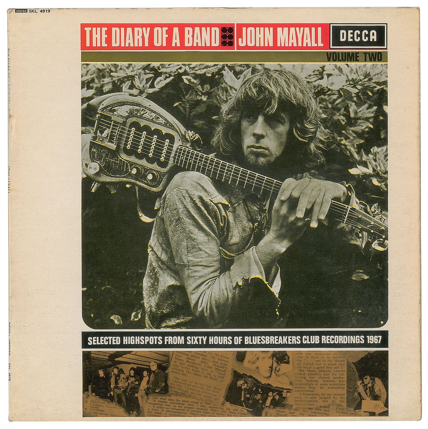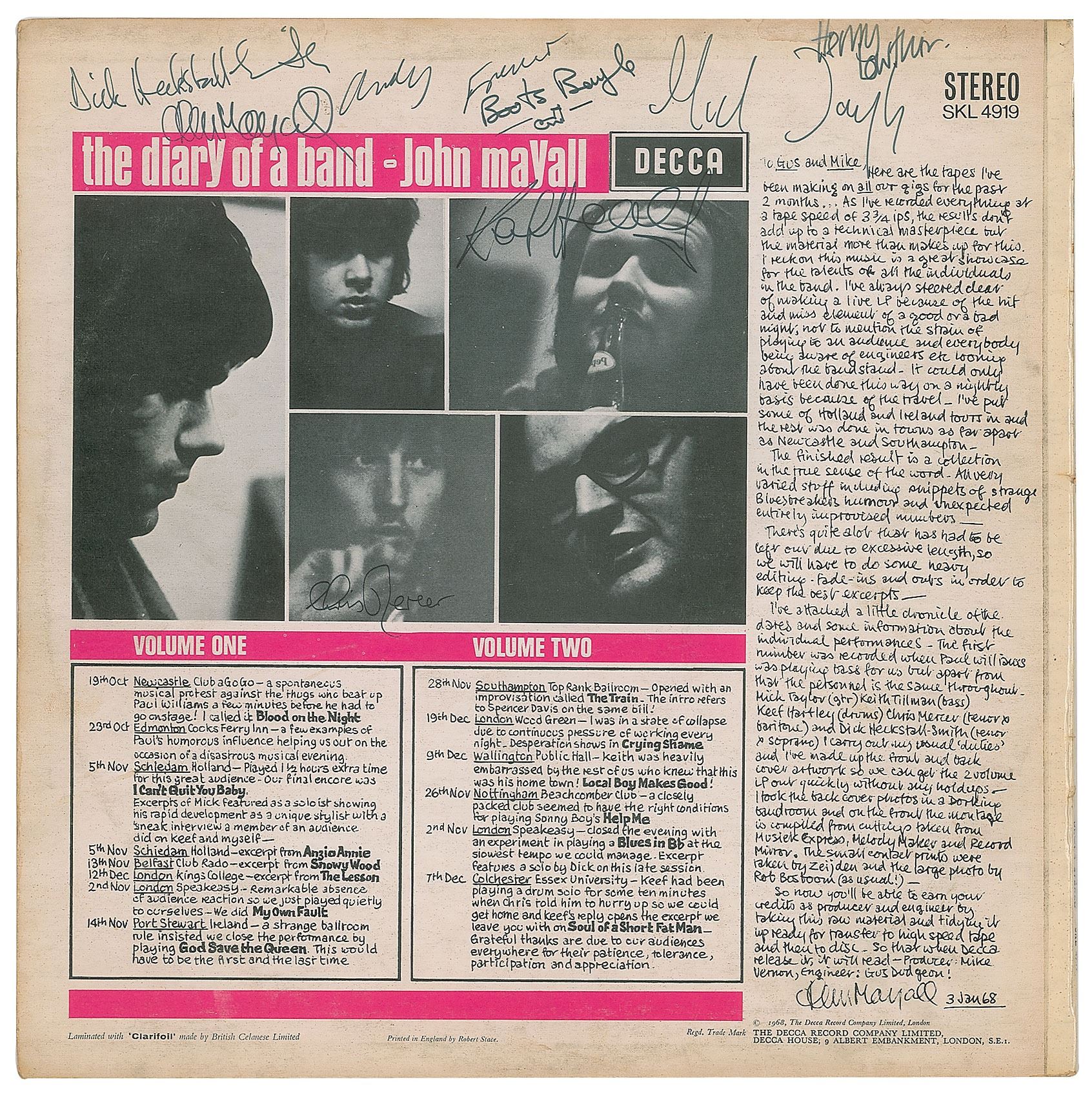 The Diary of a Band, Vol. Two album by John Mayall, signed on the back cover in black ink by John Mayall, Mick Taylor, Dick Heckstall-Smith, Andy Fraser, Boots Boyle, Henry Lowther, Keef Hartley, and Chris Mercer. In fine condition. The record is included. Accompanied by a certificate of authenticity from Tracks. A desirable multi-signed album that features a large cast of Bluesbreakers.
