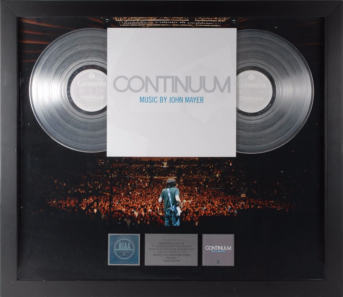 Official serial number hologram-style RIAA double platinum sales award presented “to commemorate RIAA certified multi-platinum sales of more than 2,000,000 copies of the Aware/Columbia Records release ‘Continuum.’” Expertly framed with its plate, discs, engraved plaque, and small and large images of the album cover against a background showing Mayer in front of a huge crowd to an overall size of 32.5 x 28. Award retains its original backing with an Ill-Eagle Enterprises label. In fine condition. Oversized.