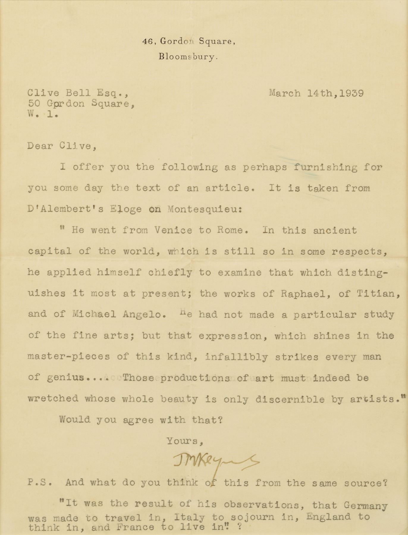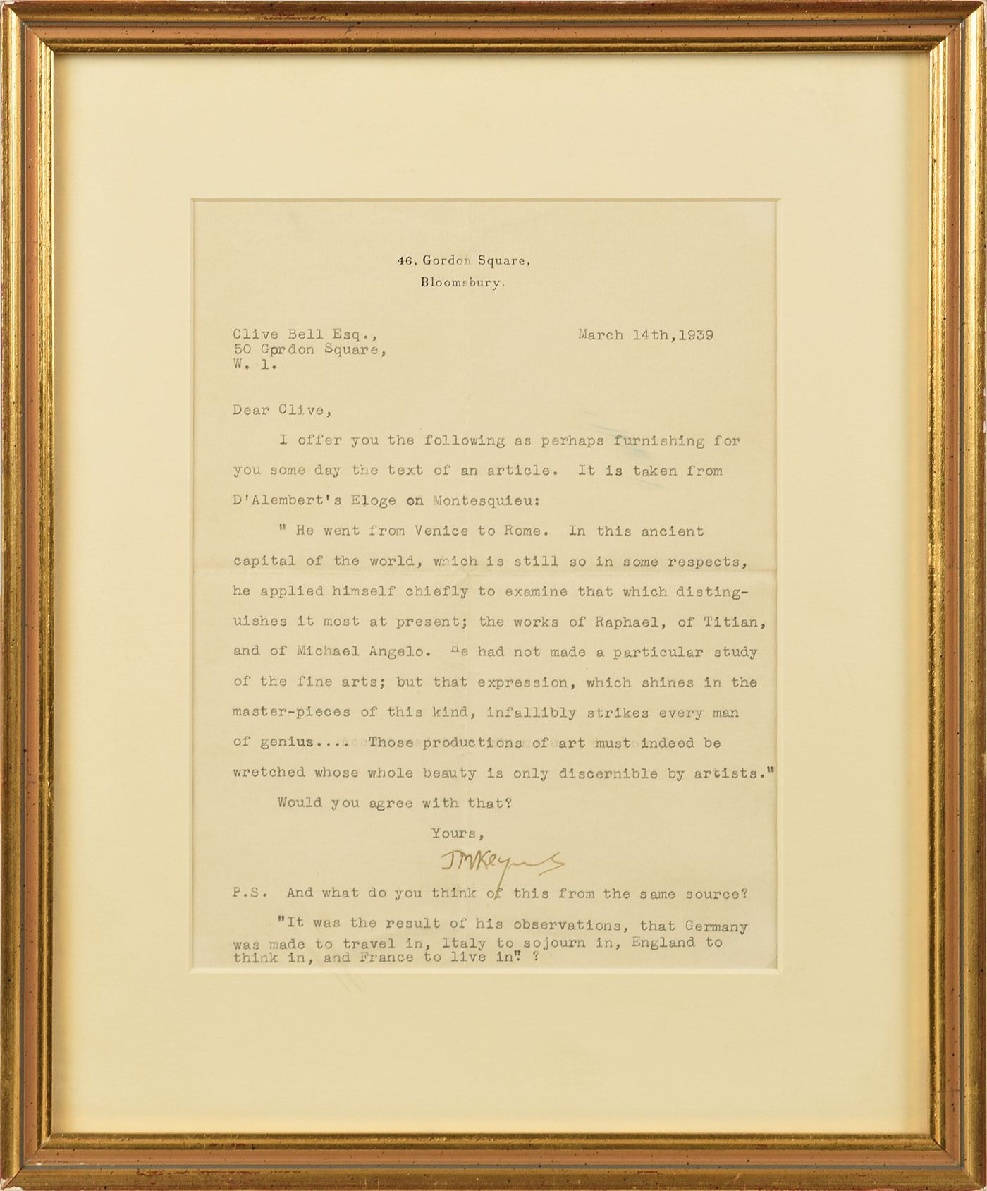 Highly influential British economist (1883–1946) who was the chief British representative at the 1944 Bretton Woods conference that established the International Monetary Fund. TLS signed “J. M. Keynes,” one page, 6.25 x 8.25, personal letterhead, March 14, 1939. Interesting letter to English art critic Clive Bell, a fellow member of the Bloomsbury Group. In full: "I offer you the following as perhaps furnishing for you some day the text of an article. It is taken from D'Alembert's Eloge on Montesquieu: 'He went from Venice to Rome. In this ancient capital of the world, which is still so in some respects, he applied himself chiefly to examine that which distinguishes it most at present; the works of Raphael, of Titian, and of Michael Angelo. He had not made a particular study of the fine arts; but that expression, which shines in the master-pieces of this kind, infallibly strikes every man of genius…. Those productions of art must indeed be wretched whose beauty is only discernible by artists.' Would you agree with that?" He adds a postscript: "And what do you think of this from the same source? 'It was the result of his observations, that Germany was made to travel in, Italy to sojourn in, England to think in, and France to live in.'?" Matted and framed to an overall size of 10.75 x 13. In fine condition. Though Keynes's calling was in the 'dismal science' of economics, he was a major supporter of the arts in England and a member of the culturally influential 'Bloomsbury Group,' a loose collective of writers, intellectuals, philosophers, and artists.