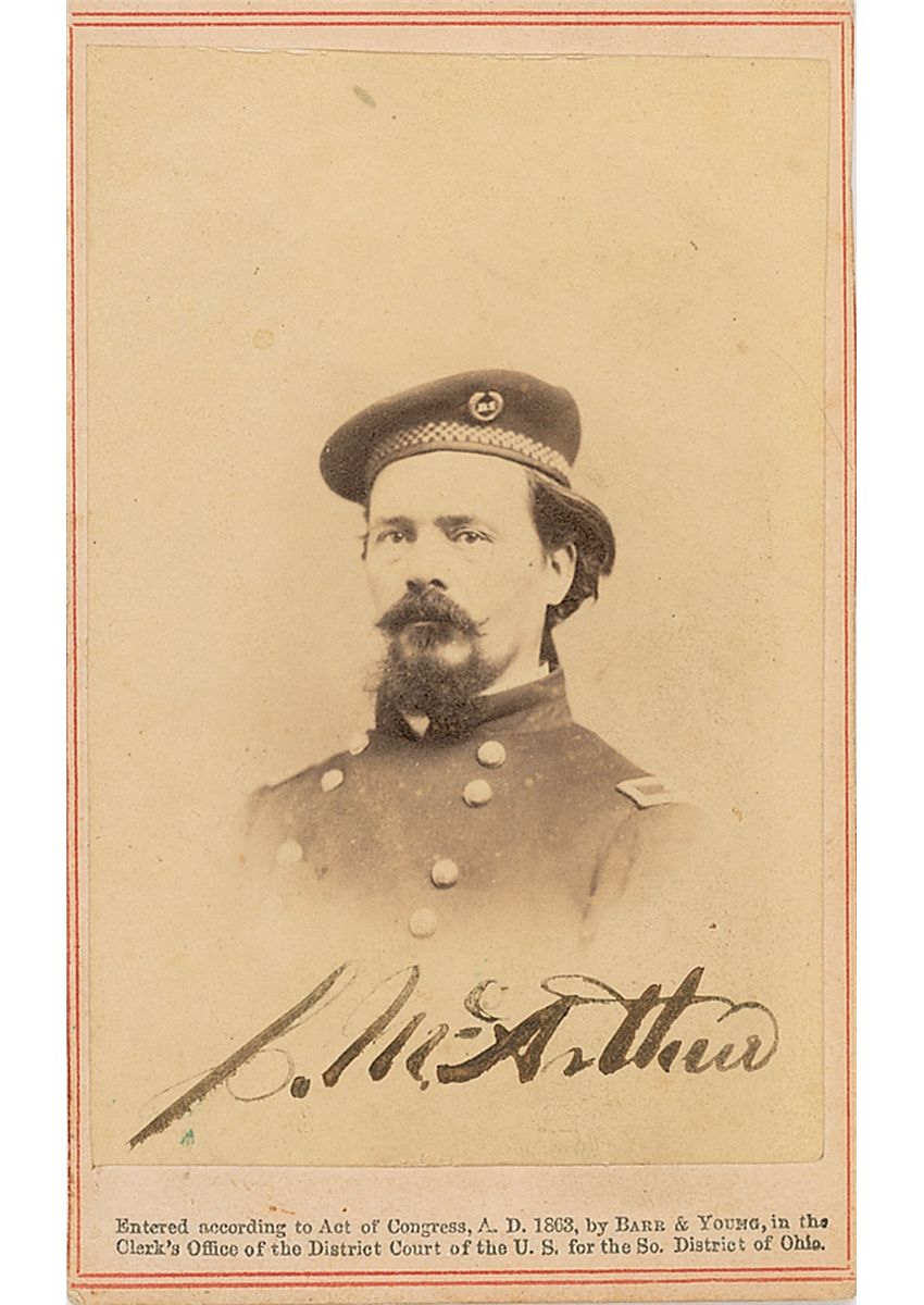 Union general (1826–1906) regarded as one of the ablest Federal commanders in the Western Theater. Highly uncommon original 2.25 x 4 carte-de-visite photo by Barr and Young of Vicksburg, Missouri, signed below the image in black ink, “J. McArthur.” In fine condition, with a bit of trivial spotting to image. The first signed image of McArthur we have ever offered.