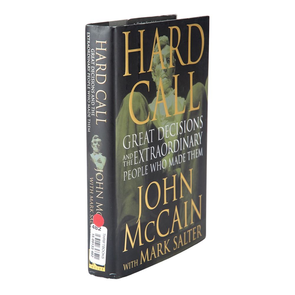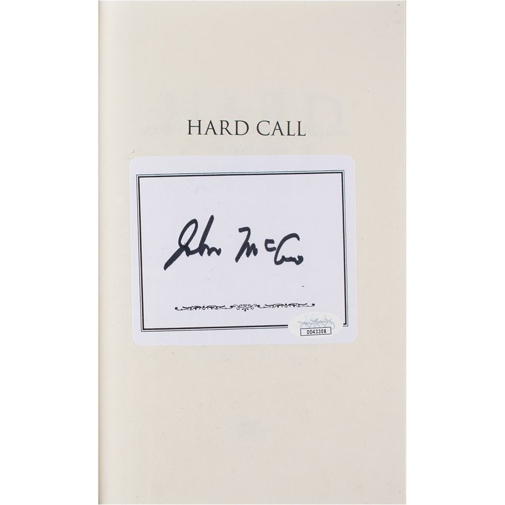 Signed book: Hard Call: Great Decisions and the Extraordinary People Who Made Them. First edition. NY: Twelve, 2007. Hardcover with dust jacket, 6.5 x 9.25, 456 pages. Signed in black felt tip on a bookplate affixed to the half-title page by John McCain. In fine condition, with a JSA label affixed to the bookplate and retail labels to jacket's spine. Accompanied by a certificate of authenticity from JSA.