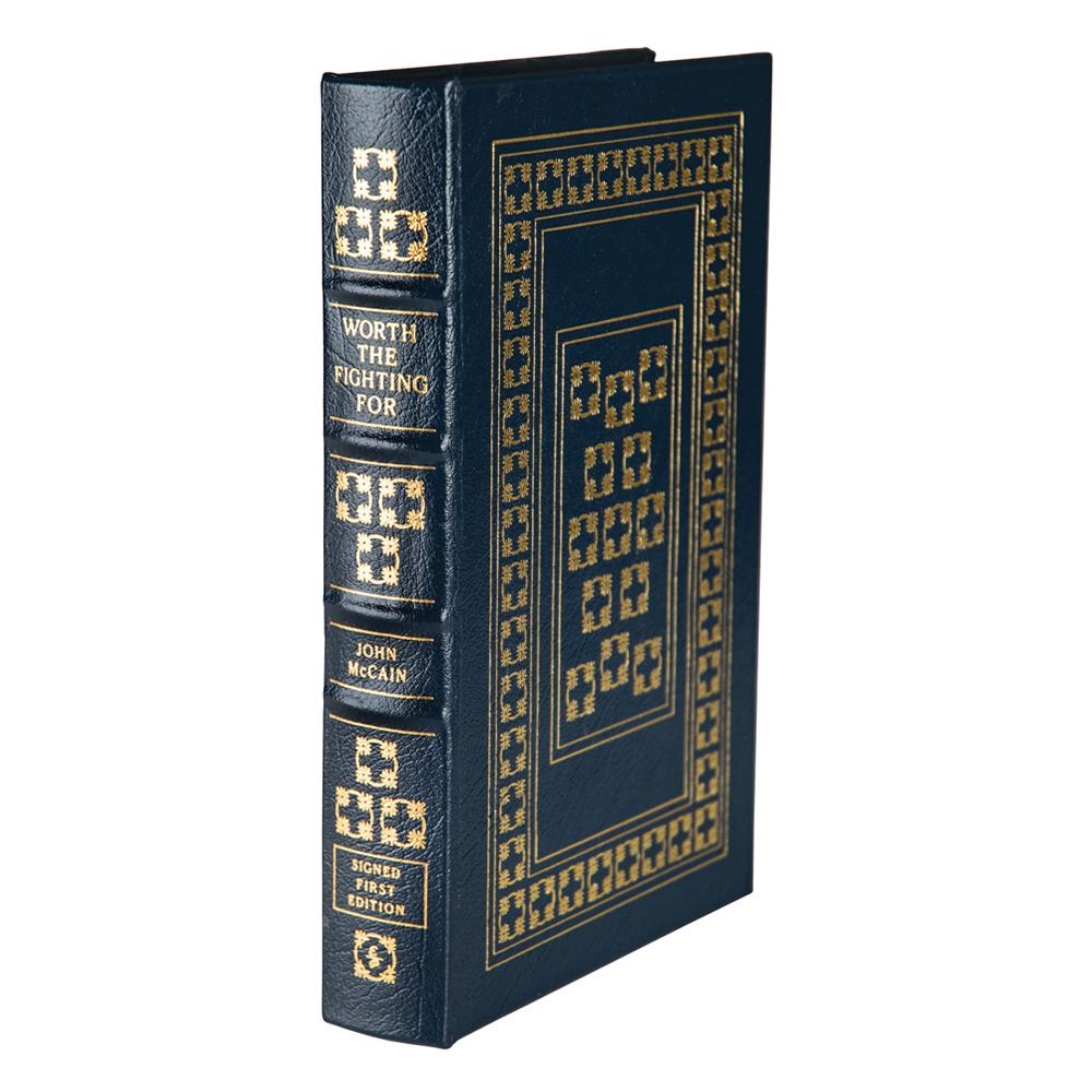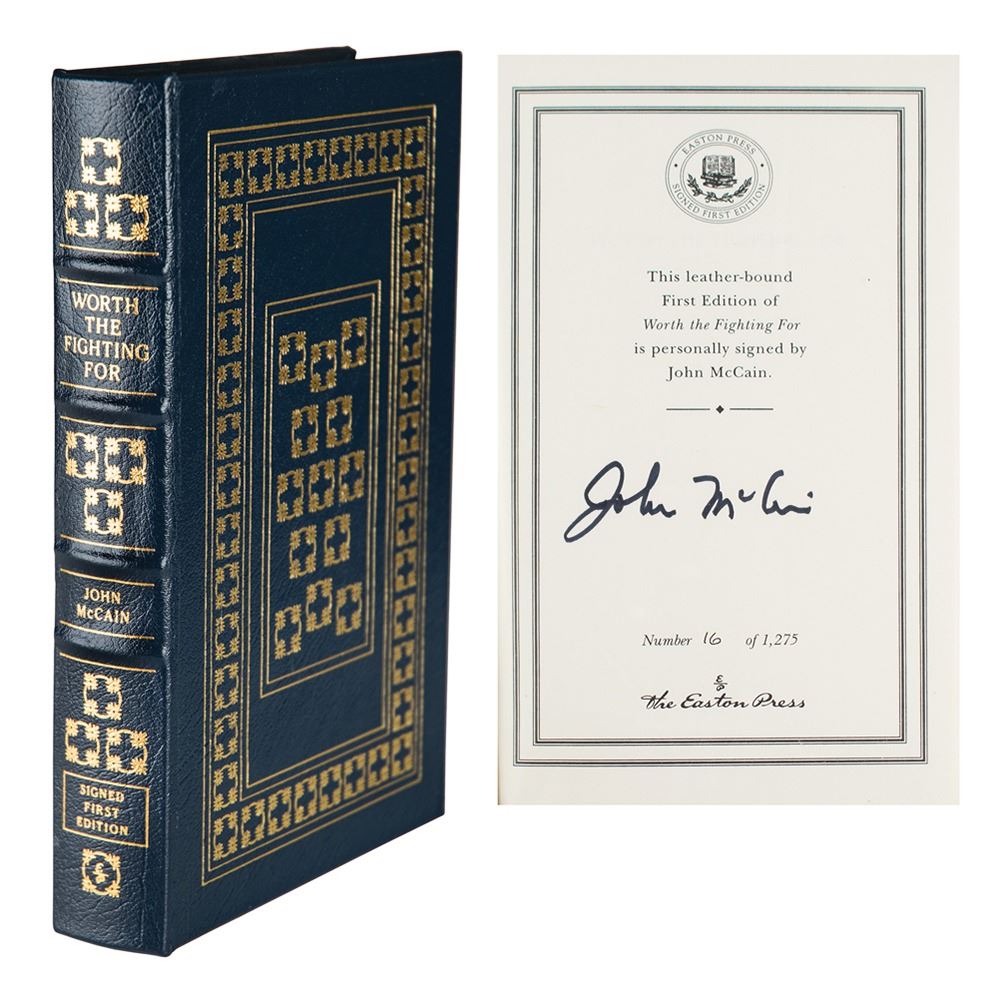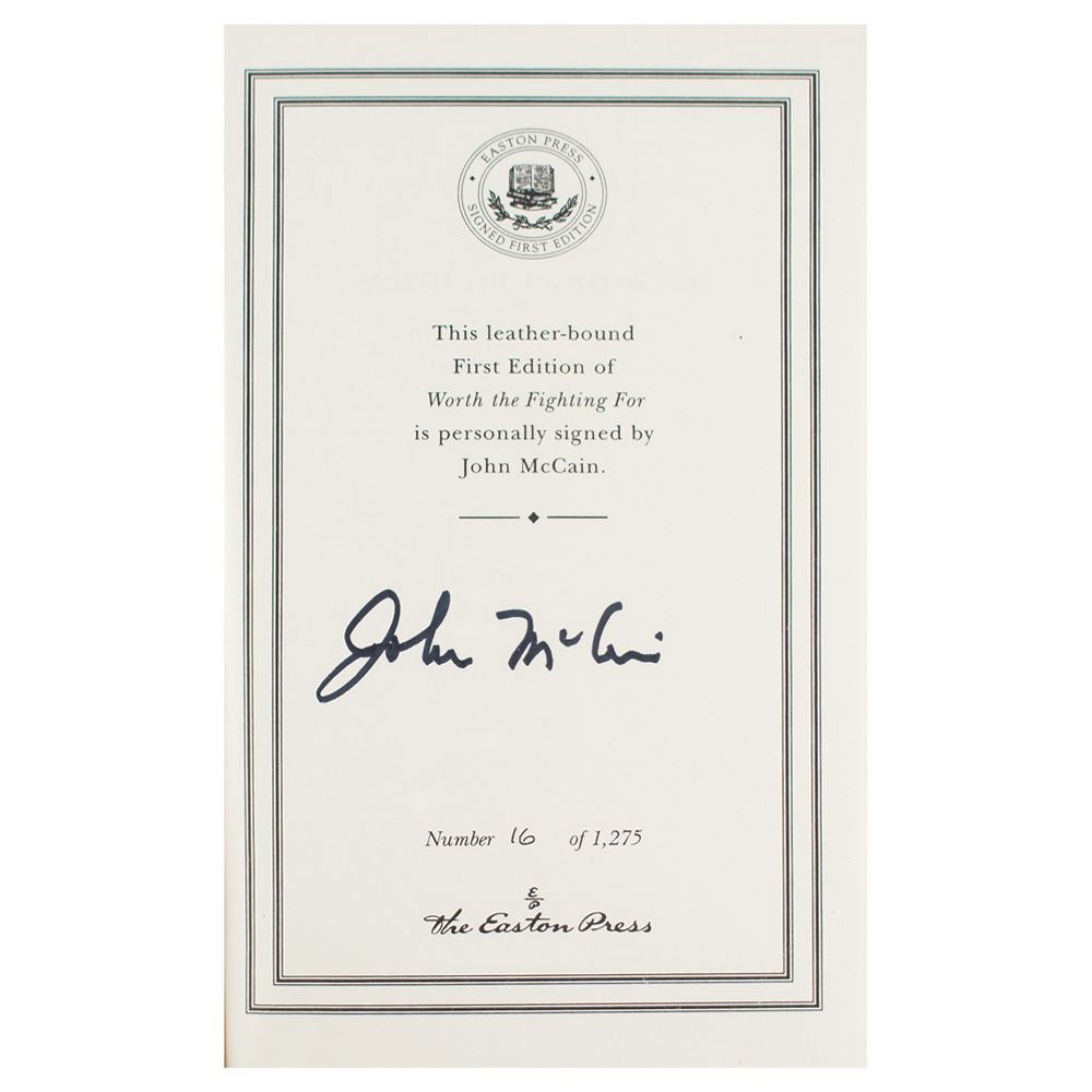 Signed book: Worth The Fighting For. First edition, limited issue, numbered 16/1275. Norwalk, CT: Easton Press, 2002. Leatherbound hardcover, 6.5 x 9.5, 396 pages. Signed on the colophon in black felt tip by John McCain. In very fine condition. Accompanied by the publisher's certificate of authenticity and one of McCain's US Senate business cards.