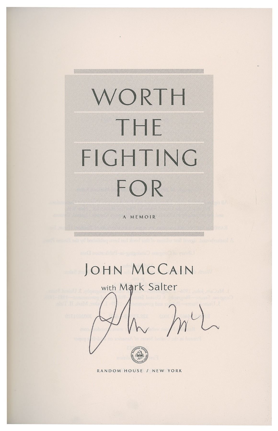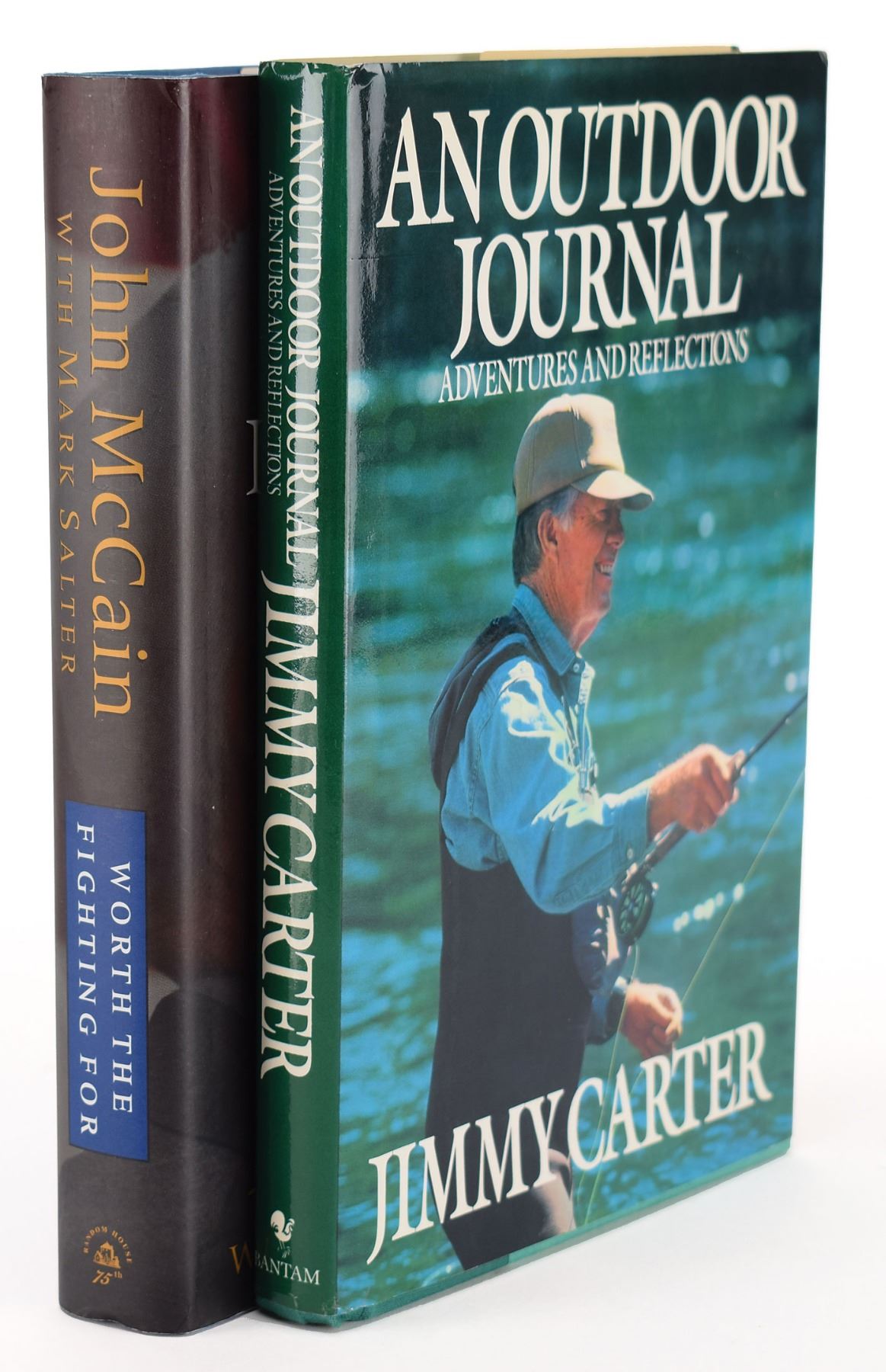 Two hardcover first edition books: Worth the Fighting For, signed on the title page in black ballpoint by John McCain; and An Outdoor Journal, signed on the title page in blue ballpoint by Jimmy Carter. In overall fine condition.