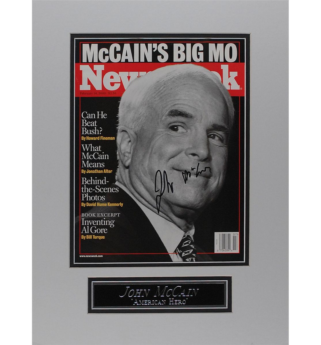 Magazine cover from the February 14, 2000, issue of Newsweek, featuring McCain, signed in black felt tip. Double-matted with a small plaque to an overall size of 12 x 16. In fine condition.