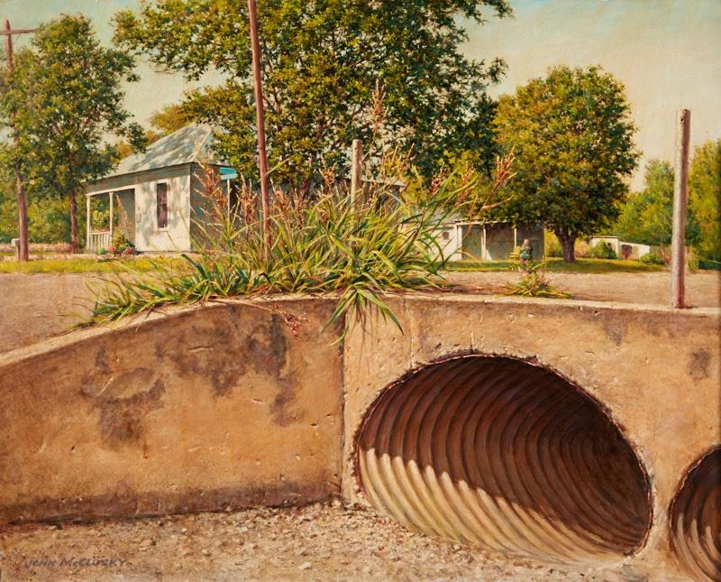 To the unaided eye, this piece appears to be in very good condition. Inspection under ultraviolet light reveals a normal fluorescence of the artist's pigments. There are no signs of damage or restoration. The piece is framed in a semi-rustic stained wooden frame with a linen liner and a semi-rustic stained wooden fillet. The frame is in good condition, showing normal signs of wear. The liner has some yellowing. Plate: Orchard and Washington, John McClusky. Verso: [handwritten on back of panel] Code #240 Orchard and Washington, Acrylic, John McClusky