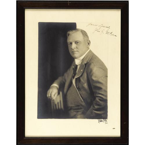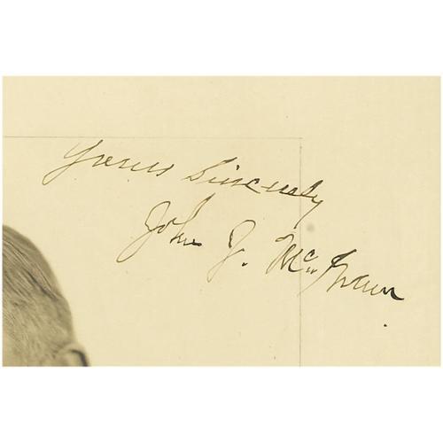 <B>1930's John McGraw Signed Large Photograph.</B></I> Outstanding studio portrait of this thirty-one year veteran of the Polo Grounds dugout was offered in lieu of payment to an innkeeper in McGraw's hometown of Truxton, New York when McGraw fell on hard times following retirement. The fine photography would stand on its own in a quality New York Giants collection, but the addition of a splendid (9/10) fountain pen inscription at upper right makes this an absolute treasure. It reads, "Yours Sincerely, John J. McGraw." The photo remains in perfect condition in its original wooden frame. Image area is 9.5x13", with final framed dimensions of 15x19". <I>LOA from PSA/DNA.</B></I>